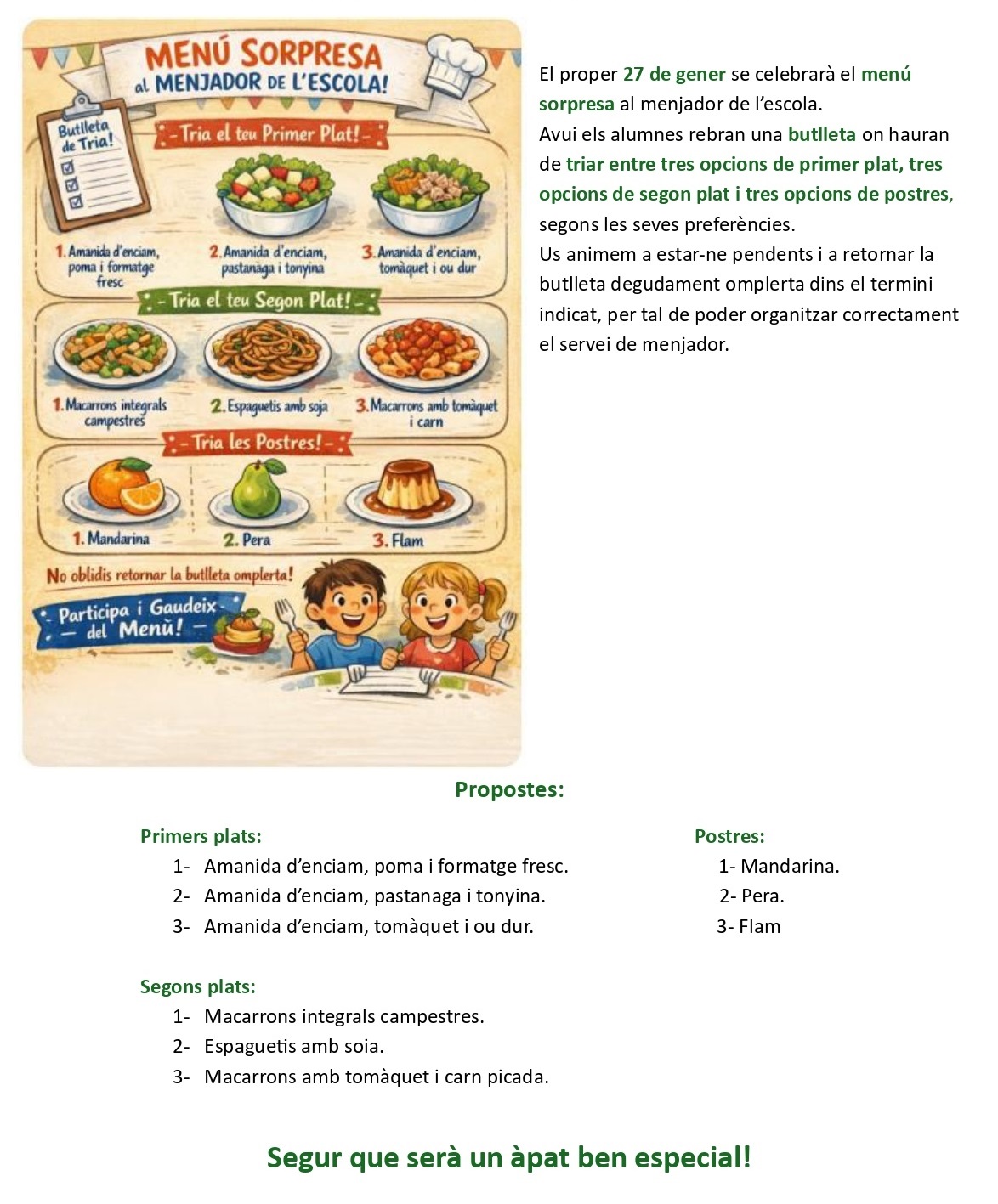 El proper 27 de gener se celebrarà el menú sorpresa al menjador de l’escola.