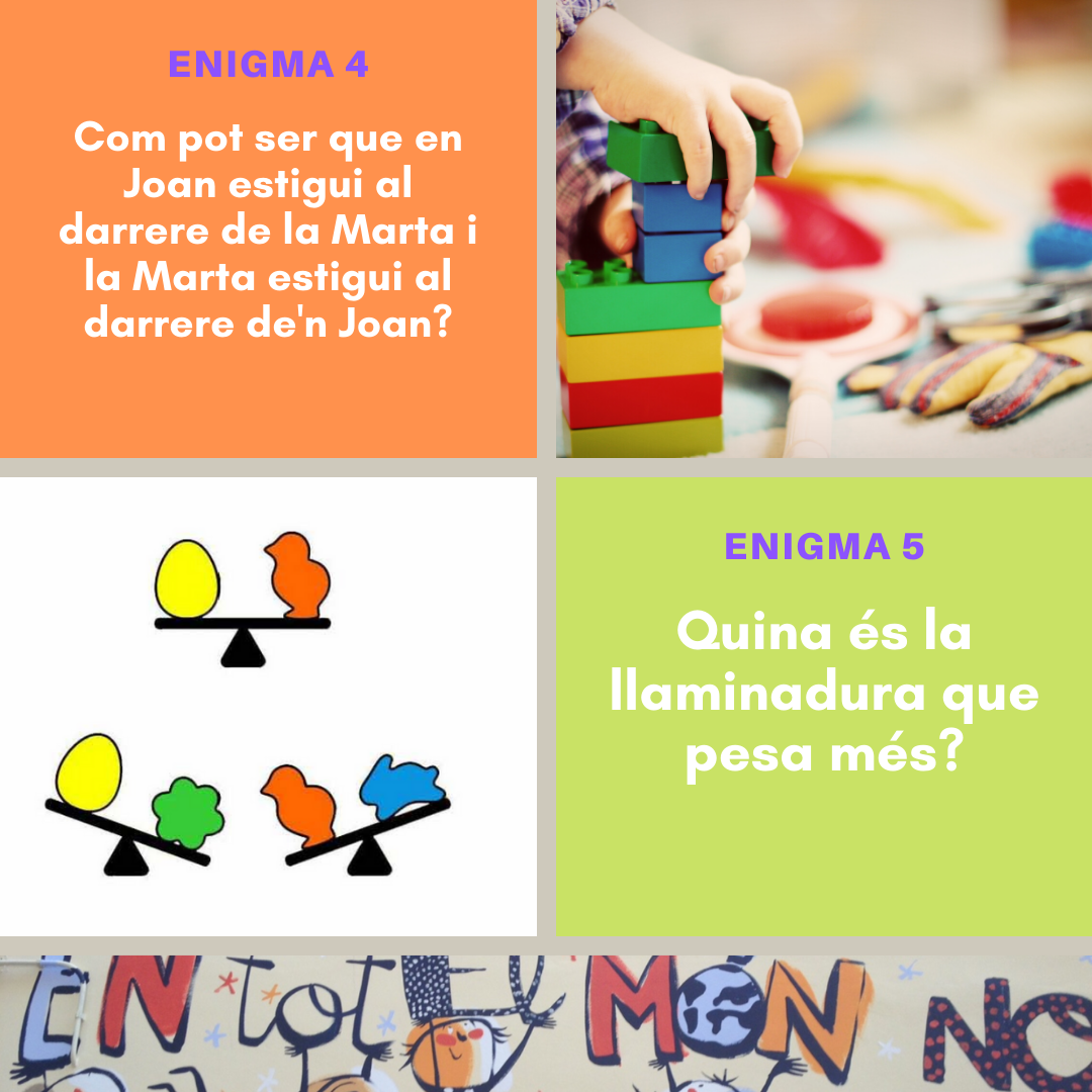 21/04/20Bon dia a totes i tots! Com esteu? Una mica passats per aigua… això és la primavera! 😉 Va, anem per feina! Us proposem dos nous enigmes, a veure si els podeu resoldre. També us expliquem una novetat. A partir d’aquesta setmana els enigmes només sortiran els dimarts. Els divendres, i altres dies de la setmana podreu trobar altres propostes molt xules i interessants a la web de l’escola. Us animem que la mireu sovint. Ah, i com sempre felicitem els participants! Enhorabona al Saúl i a la Paula. Una abraçada!