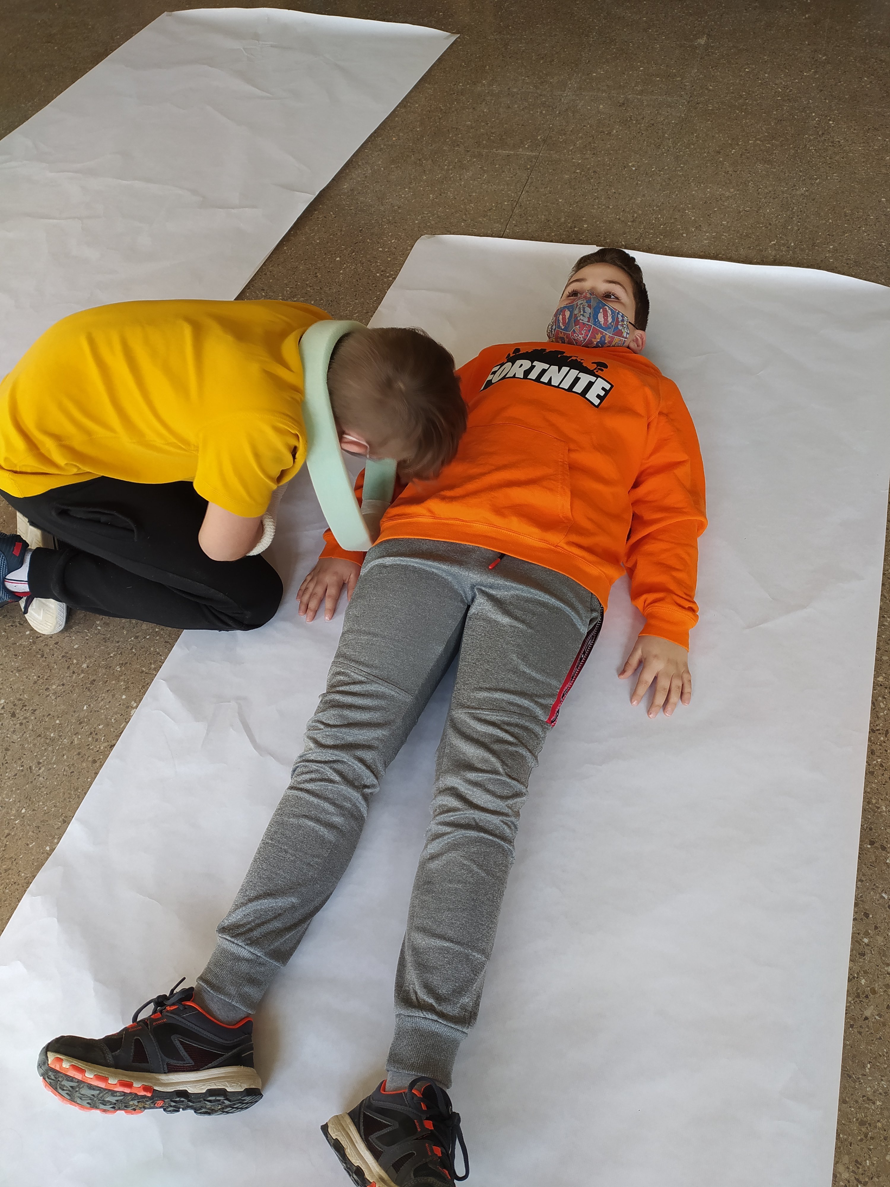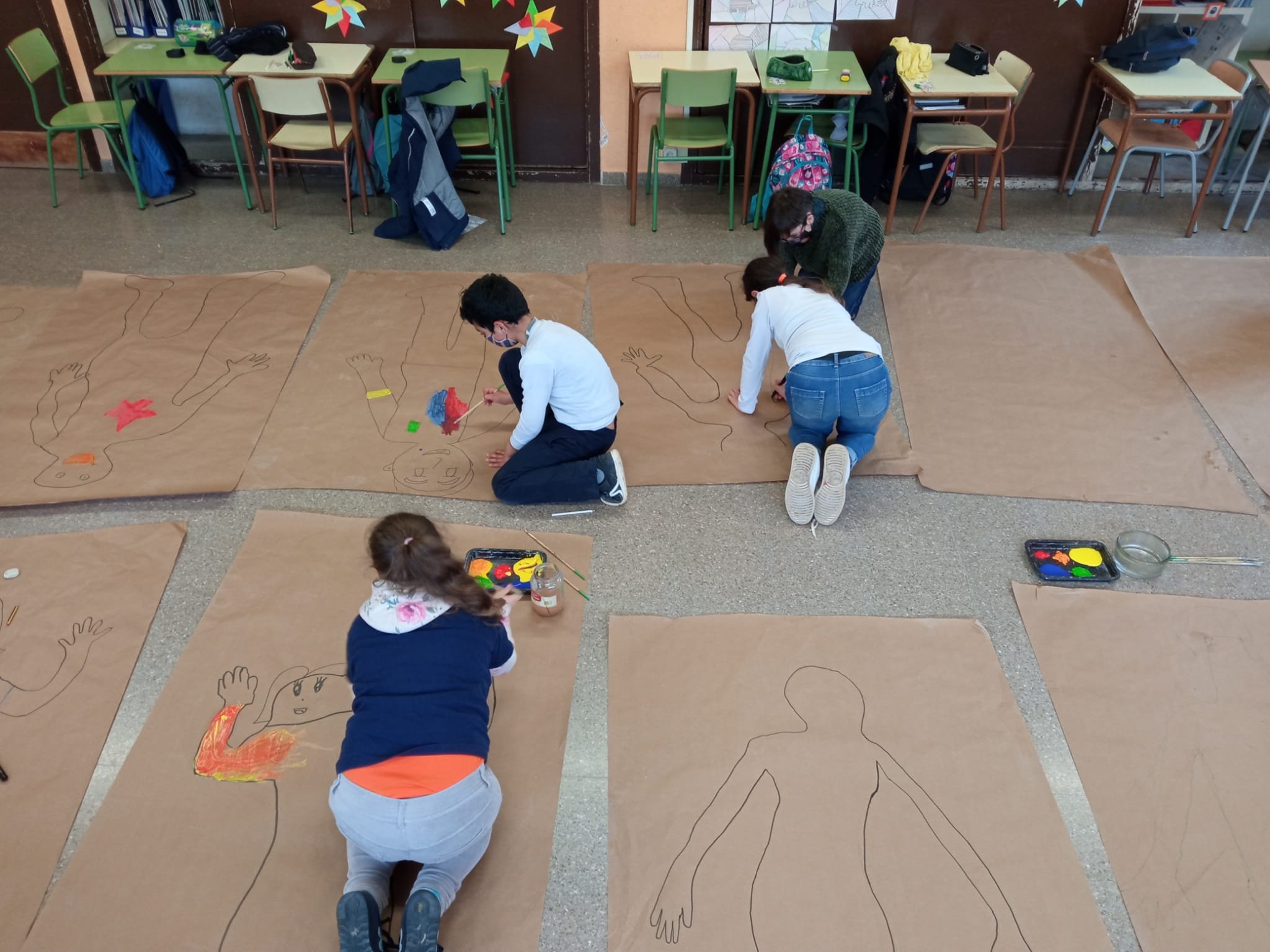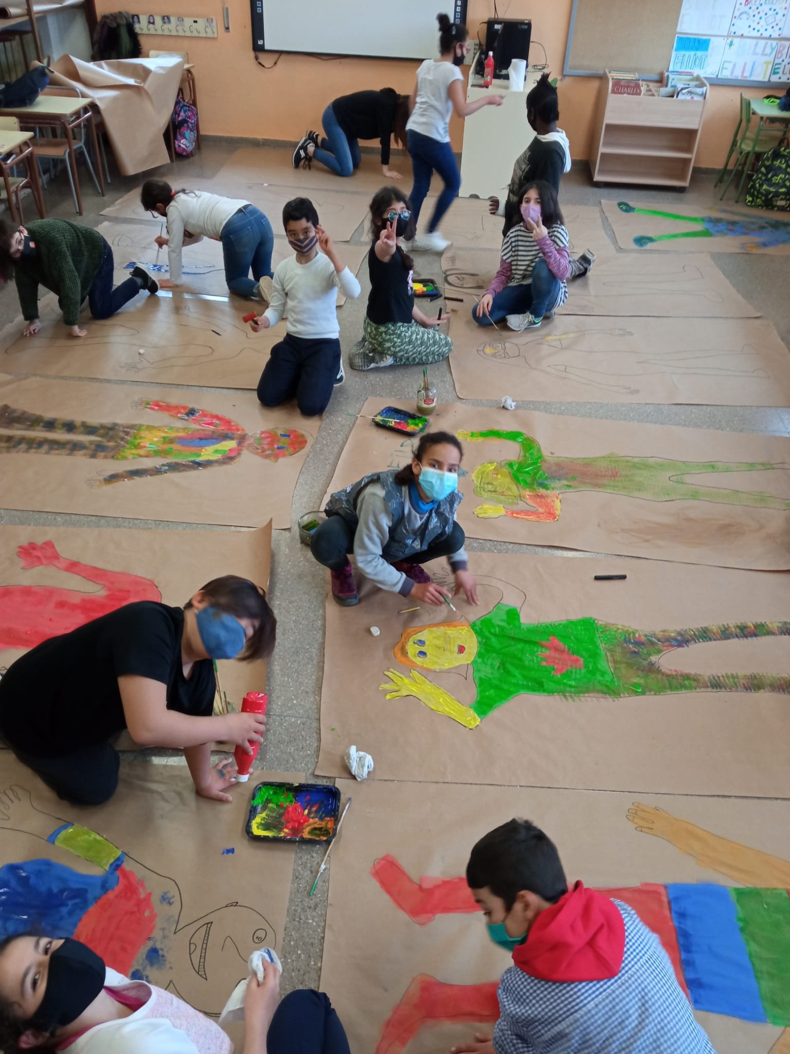 Els alumnes de 5è hem dibuixat el nostre cos. Ajudant-nos uns als altres, primer hem dibuixat sobre el paper la nostra silueta. Després cadascun de nosaltres hem hagut de pintar la nostra cara i el nostre cos. Així també ens coneixem més ! Finalment hem penjat els treballs a l’escala i passadís de l’escola.