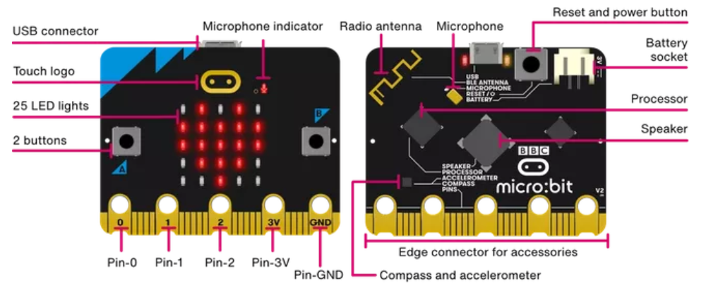 micro:bit és una placa de circuit electrònic dissenyada perquè els estudiants aprenguin electrònica, codificació i desenvolupen el pensament computacional per poder portar a terme alguns projectes escolars. La placa inclou botons, llums, altaveu, micròfon i sensors que es faciliten a crear projectes interactius sorprenents.
