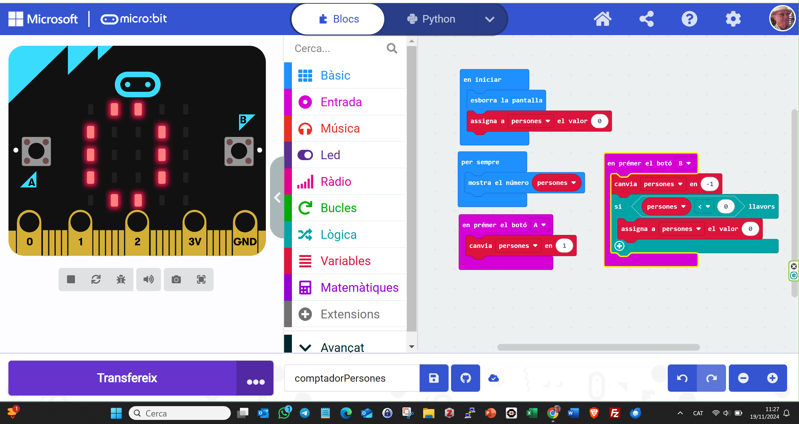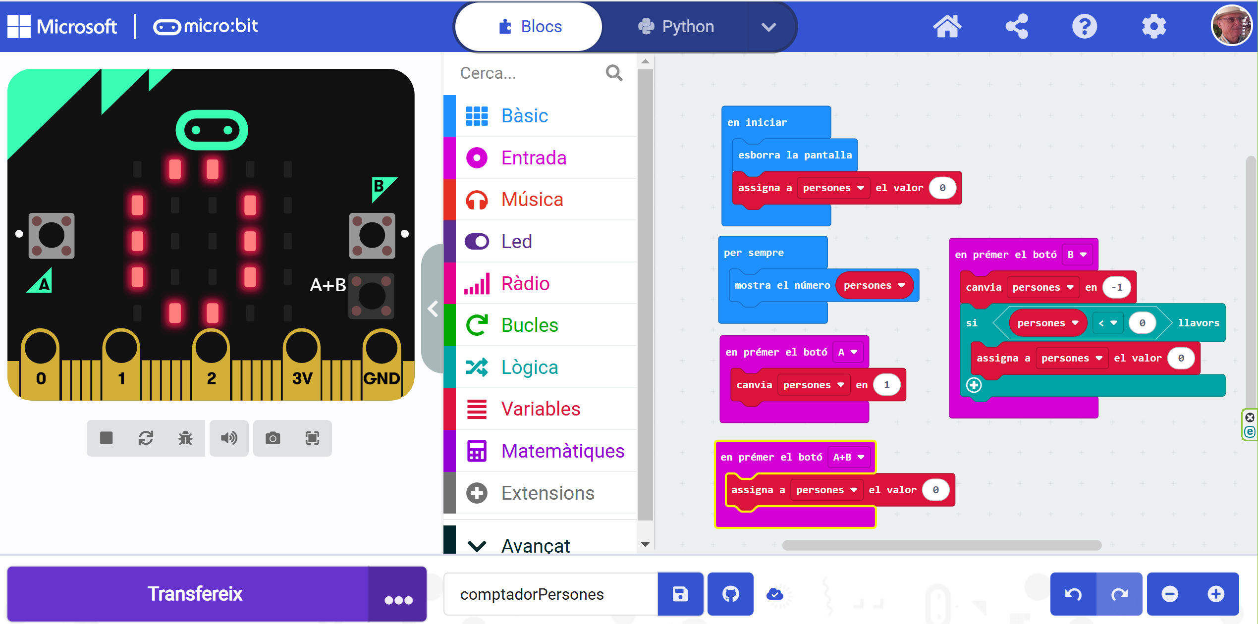 Trataremos de programar una mico:bit que nos permita contar las personas que entran o salen de una aula, o de la escuela.