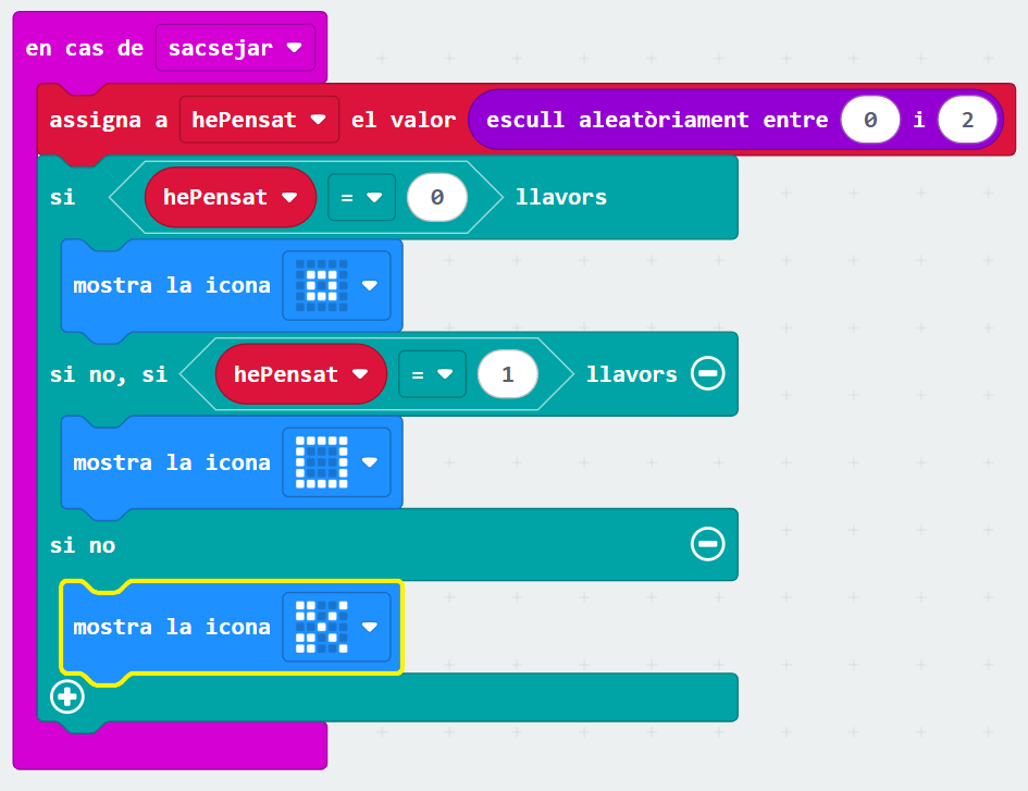 El programa utiliza selección (Sí, si no) para decidir qué imágen mostrar en la pantalla LED. Si el número era 0, muestra una el icono de una piedra. Si era un 1, muestra un icono representando al papel. Si no era ni 0 ni 1, debe ser 2 porque le hemos indicado al micro:bit que sólo genere números aleatorios entre 0 y 2, así que mostramos unas tijeras.