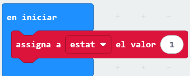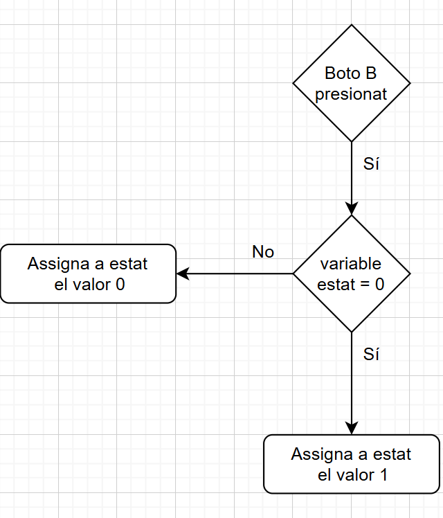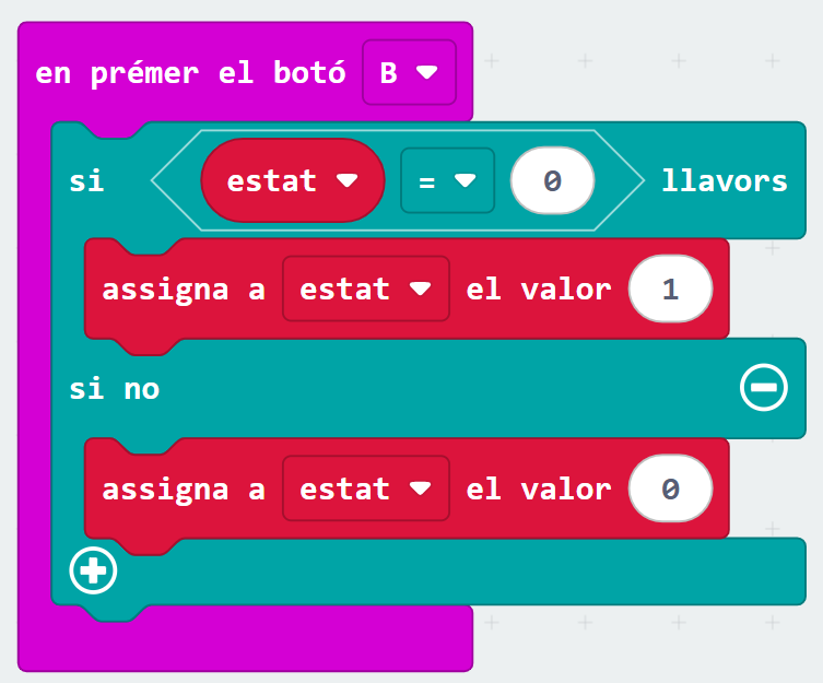 Ara només cal automatitzar lo anterior i seria gestionant la variable de memòria “estat” amb un interruptor, per exemple, el botó B de la placa micro:bit.