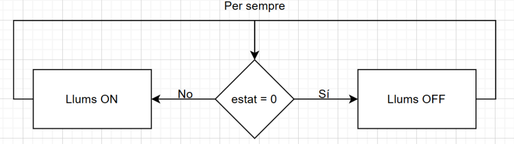 La variable de memòria ”estat” estarà en OFF = 0, o en ON = 1 i els LEDs estaran OFF o ON depenent de la variable.