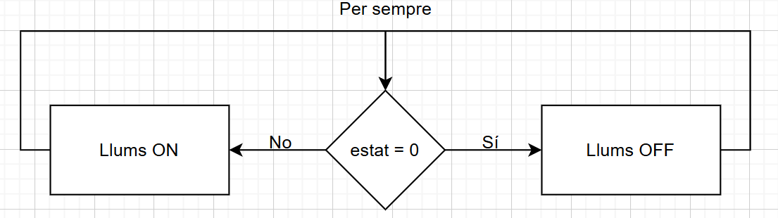 La variable de memòria ”estat” estarà en OFF = 0, o en ON = 1 i els LEDs estaran OFF o ON depenent de la variable.