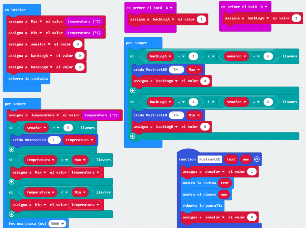 Temperatura – Back Log La solución a la pérdida de pulsaciones de los botones A i/o B de la práctica anterior Puede ser reducida en instrucciones si decidimos que al apretar el botón A o B siempre ponga la tarea de mostrar temperatura máxima o mínima en el backlog: