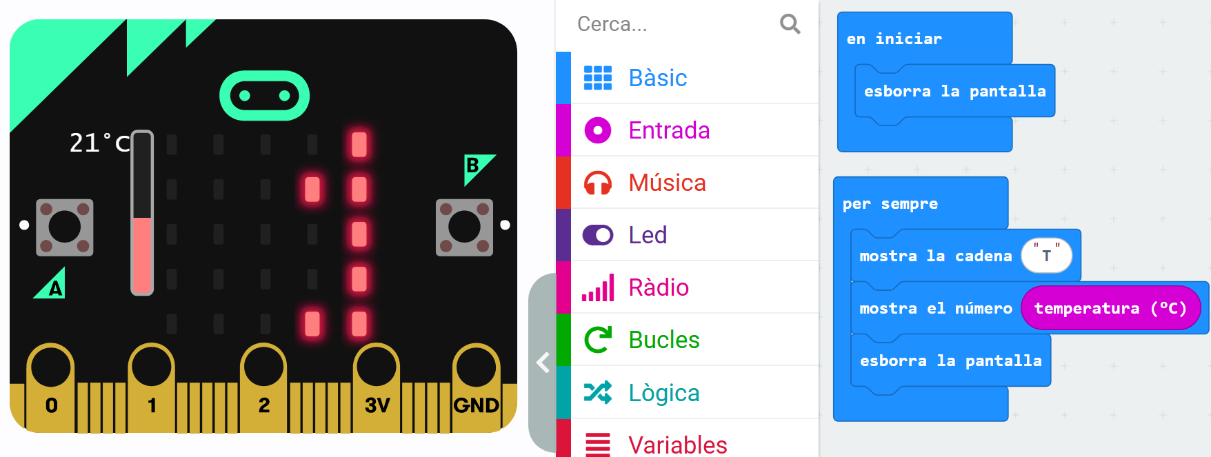 Nota: La instrucción “esborra la pantalla” dentro del bucle “per sempre” es necesaria en el caso que la temperatura (T) tenga un valor de un solo dígito para que no quede permanente visible en los LED entre lectura y lectura de la temperatura.