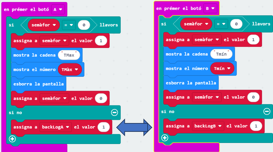 Ahora, solo queda incrementar el bucle “per sempre” con unas instrucciones que ejecuten el Back Log de cada botón. Es decir se ejecutaran las tareas pendientes si se dan dos condiciones: