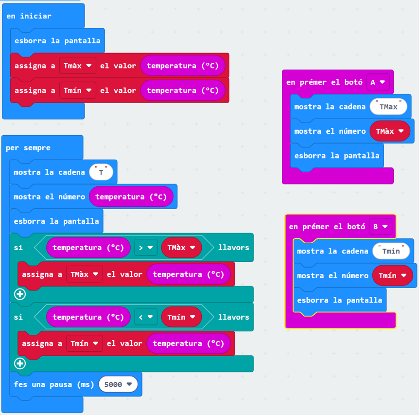 - Determinar también, cual es la temperatura máxima i mínima durante una sesión de captura de temperaturas y mostrarlas al presionar los botones A (Màxima) o el boton B (Mínima)