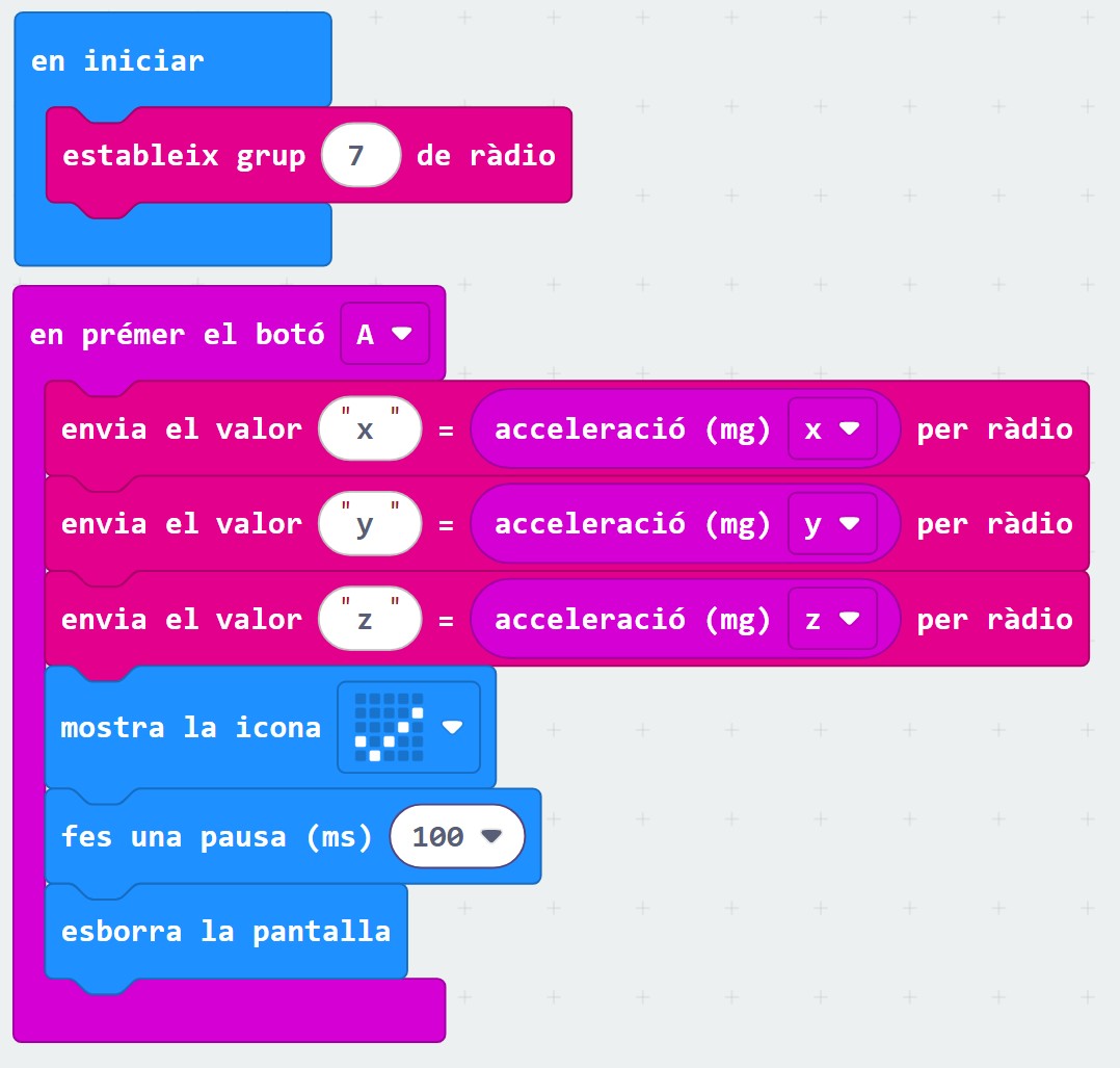 Cada vegada que premem el botó A a la micro:bit emissora (A), veurem a la pantalla de l’ordinador com arriben els valors del sensor d’inclinació (acceleròmetre) de la placa A.
