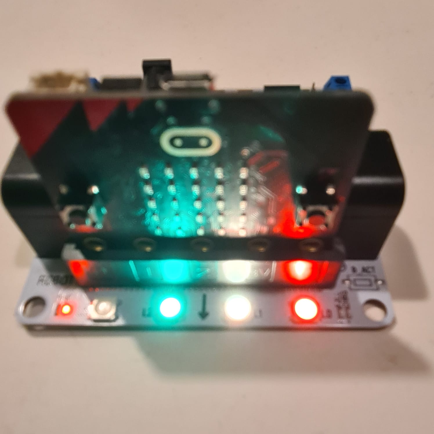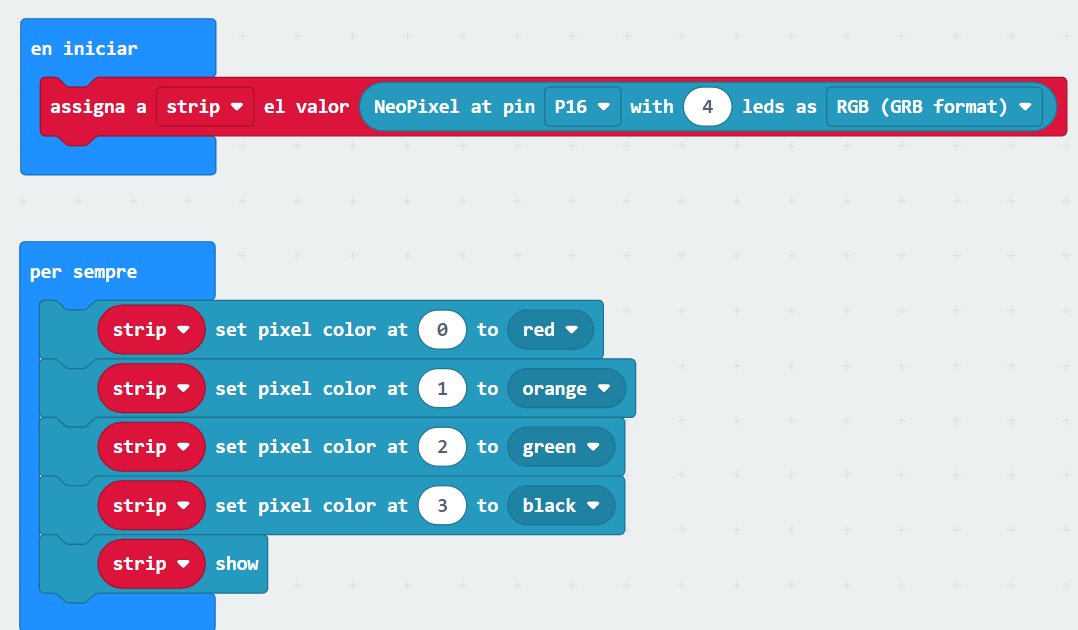 “LED Neopixel situats davant de la ranura on s’insereix micro:bit. La micro:shield disposa d’una tira de 4 leds RGB útil per crear senyals de llum, per exemple: en detectar un soroll fort, per avisar que s’ha complert una condició de temperatura, per mostrar diferents colors, per crear un llum d’emergència, etc. Aquests leds, que estan connectats internament a la placa micro:bit a través del pin P16, es programen igual que una tira de LEDs Neopixel, utilitzant la seva extensió de MakeCode. La qual incorpora l’extensió NeoPixel que hem vist abans”.