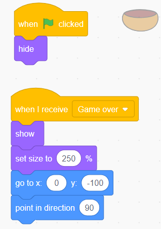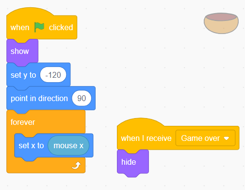 – Al finazar el juego situar un número de fresas igual, al numero de fresas capturadas encima del bol; para ello podemos crear un nuevo bol, bol2 y una nueva fresa, la fresa2 y realizar la siguiente programación: