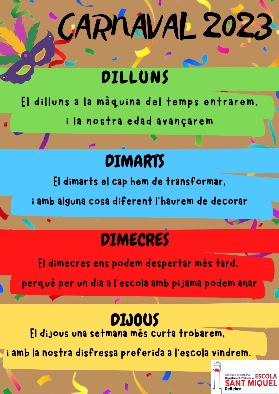 Arranquem la setmana més divertida de tot el curs, la setmana de Carnaval!!!! Les consignes d’aquest any són: