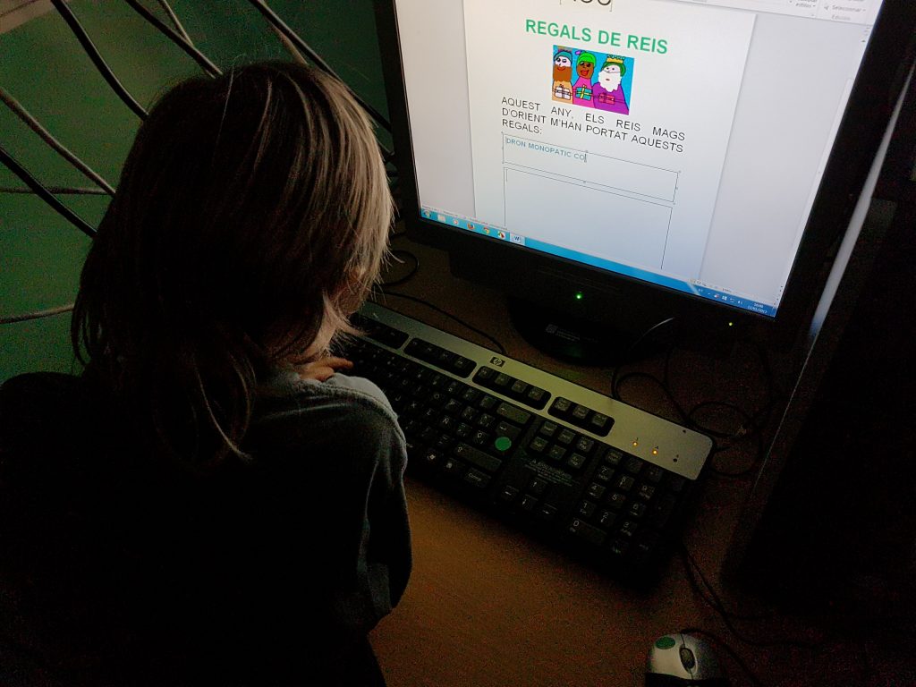 Després de les primeres sessions a l’aula d’informàtica, els més petits, SOMNIS i MAGS, hem iniciat el treball amb el processador de text. Tot un repte trobar la posició de les lletres al teclat, separar les paraules, escriure amb majúscules…