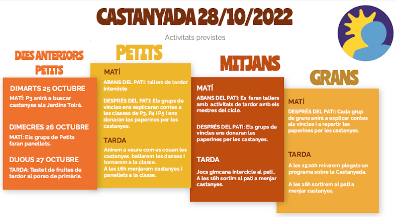 La tardor, temps de castanyes i moniatos. Un curs més, quan arriba finals d’octubre, celebrem la festa de la Castanyada a l’escola. Les activitats han estat diverses i variades segons els cicles. Així, els més petits han anat a buscar castanyes, han fet tasteig de fruites de tardor… Els mitjans i grans han fet activitats i tallers de tardor, han preparat i explicat contes als vincles. Aquest any més que tardor semblava estiu per la bonança del temps.