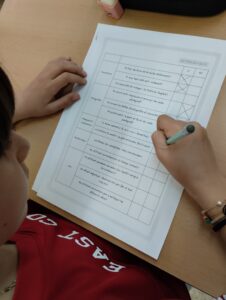Organitzats en grups cooperatius, vam començar a construir les nostres històries. Per fer-ho, vam treballar l’estructura del text narratiu (plantejament, nus i desenllaç), vam definir personatges i escenaris, i vam aprendre a utilitzar connectors per donar coherència i fluïdesa als textos. Aquest procés ens ha ajudat a entendre millor com es construeix un relat i a millorar la nostra expressió escrita.