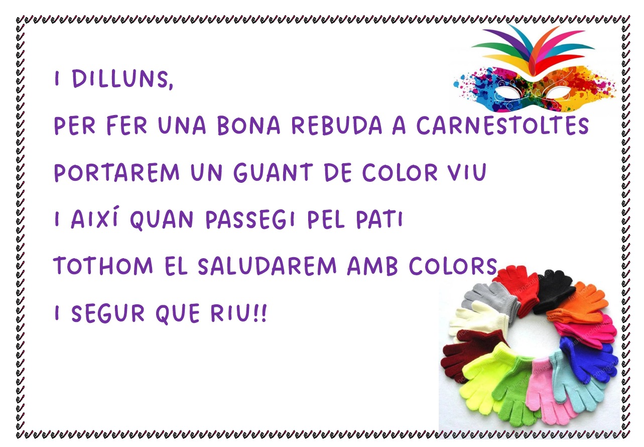 I ja tenim les consignes que haurem de seguir:dimarts tots amb pijama, ben còmodes! Dimecres ens vestirem com si fos una altra estació,tardor, estiu o primavera, deixeu volar la imaginació! I dijous cap a l’escola ben mudades i mudats!