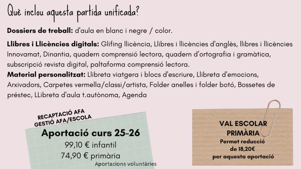 Des dels inicis de la nostra escola, l’aportació corresponent a llibres, llicències, dossiers i materials personalitzats és unificada, quelcom que està recollit a les nostres NOFC. Això vol dir que s’aporta un import igual a tots els nivells des d’I3 fins a 6è de primària, el qual es calcula d’acord amb el cost anual previst en relació a aquests conceptes. Aquest import s’aprova anualment a consell escolar. Això permet comprar materials com llicències d’escola d’ús compartit o aprofitar materials propis en diferents cursos al llarg de l’escolarització. Per exemple: la carpeta de l’artista es compra a 3 anys i es fa servir fins a 6è de primària. Us adjuntem el detall dels conceptes: