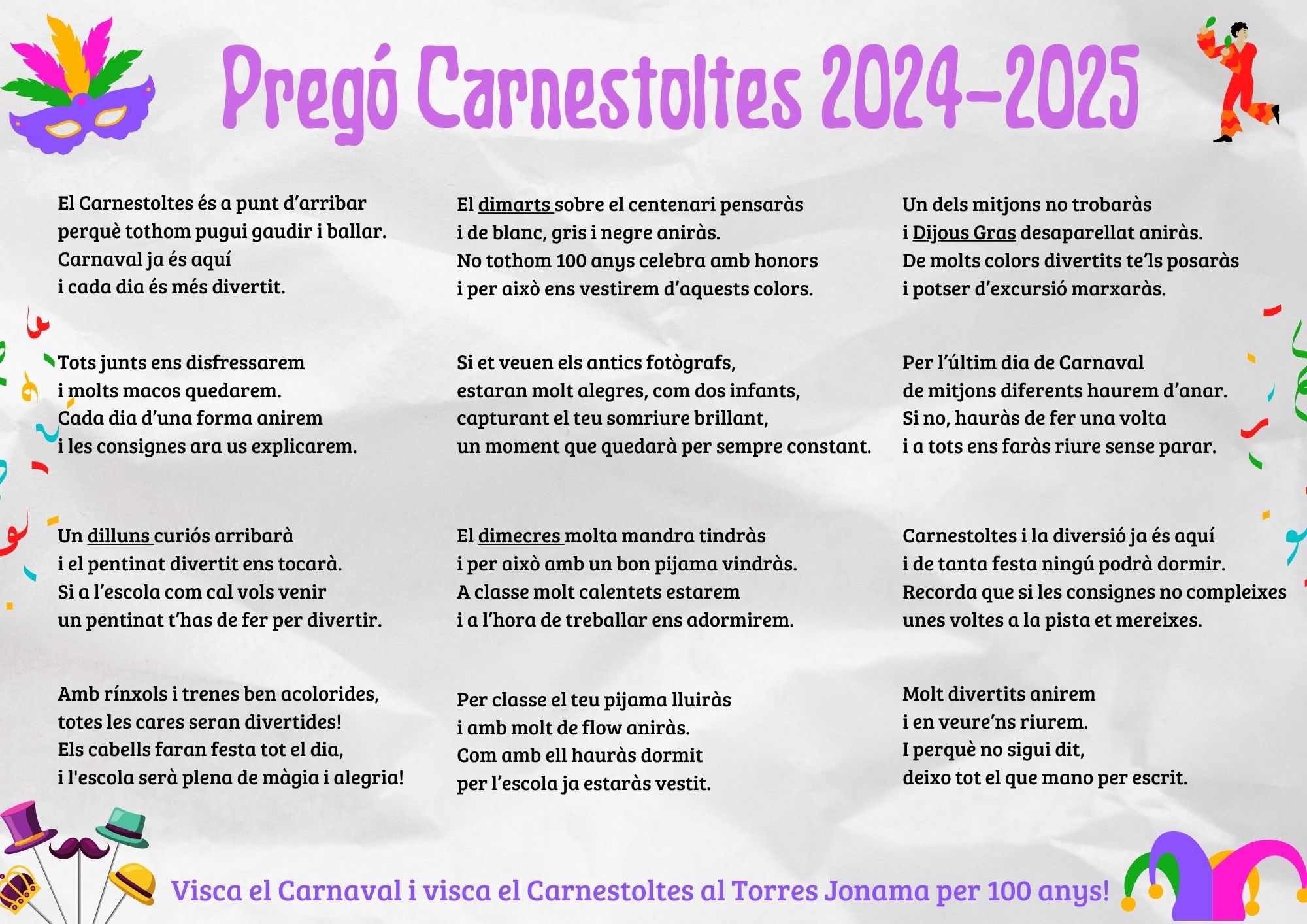 Carnestoltes’25 admin21/02/25 Benvolguts i benvolgudes, Us adjuntem el pregó de Carnestoltes d’enguany, així com les consignes de la setmana del 24 al 27 de febrer. Recordar que e divendres 28 de febrer i el dilluns 3 de març són dies de lliure disposició i no hi haurà classe.