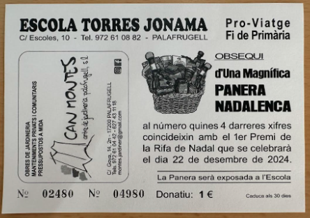 Sorteig nadal admin14/01/25 El número premiat al sorteig de la Grossa de Nadal del 22 de desembre de 2024 és el 72480. Donat que la butlleta no es va vendre, properament tornarem a organitzar una rifa per sortejar el lot. Gràcies per participar, Alumnat i tutores de 6è