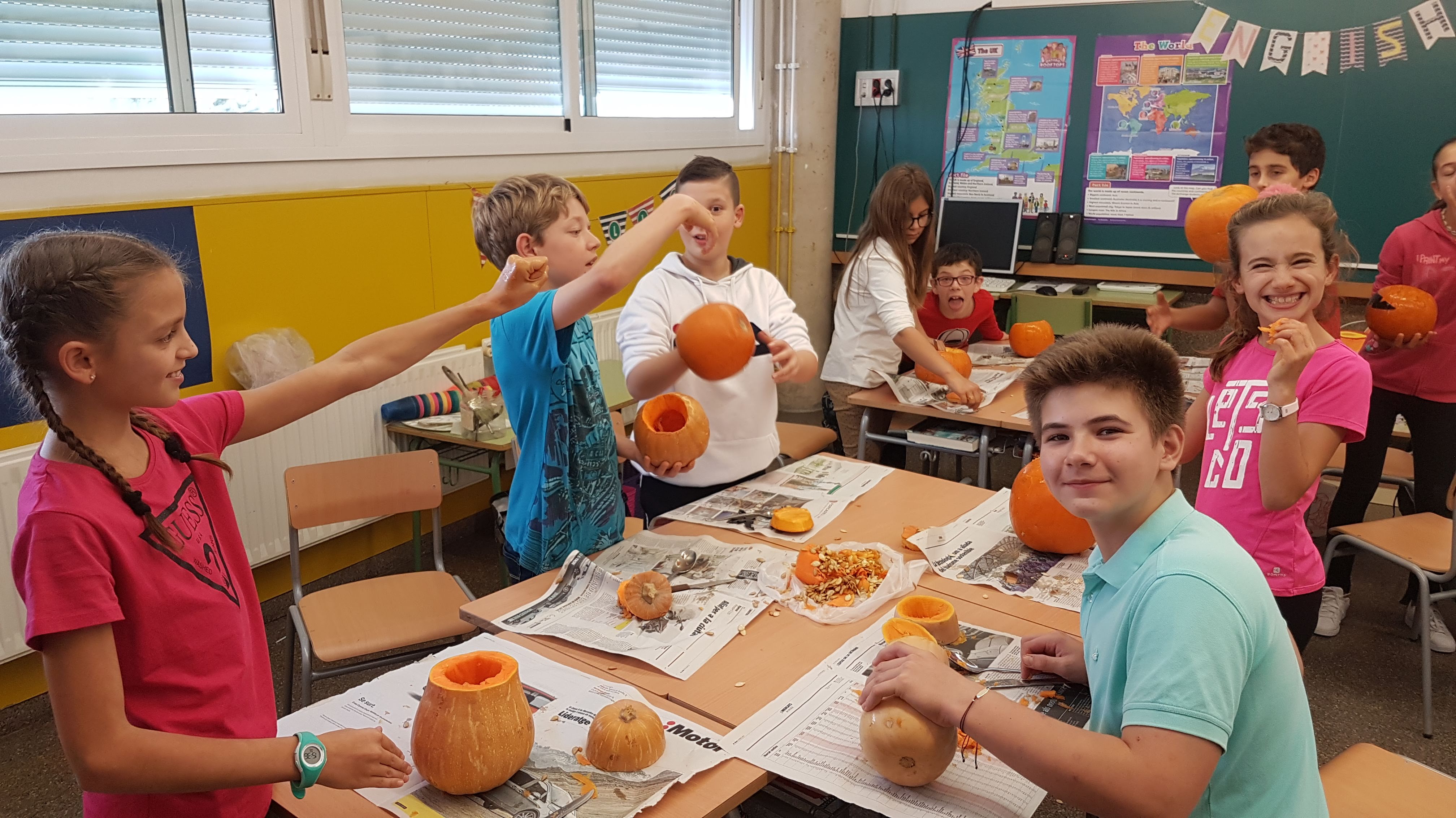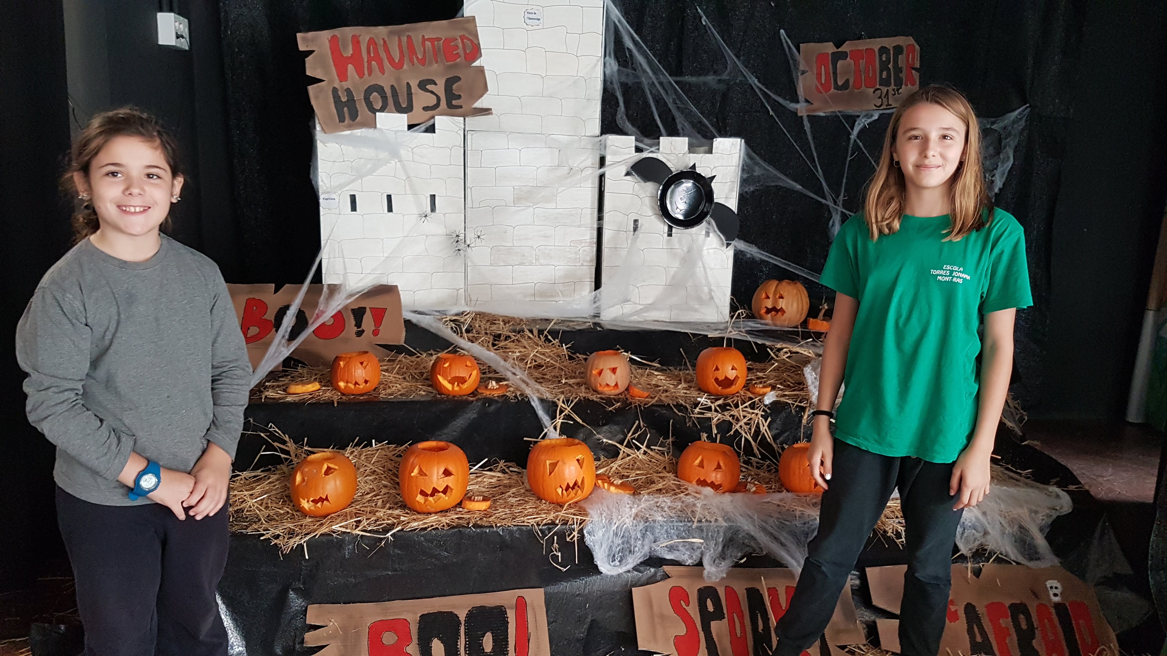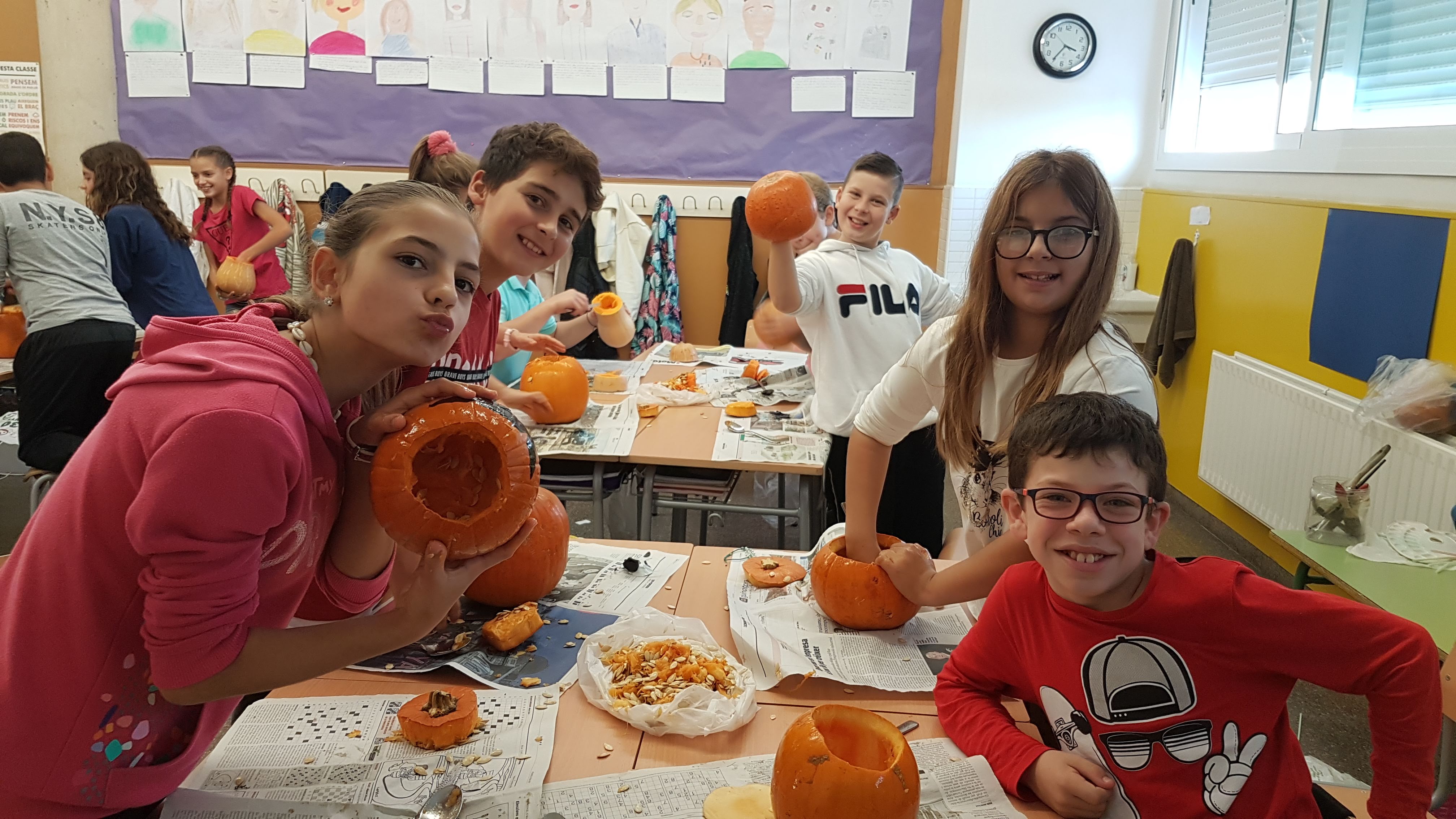 Els nens i nenes de 6è varen buidar i  decorar les “pumkins” . Cada classe  va fer una manualitat per tal de decorar una terrorífica aula d’Anglès .