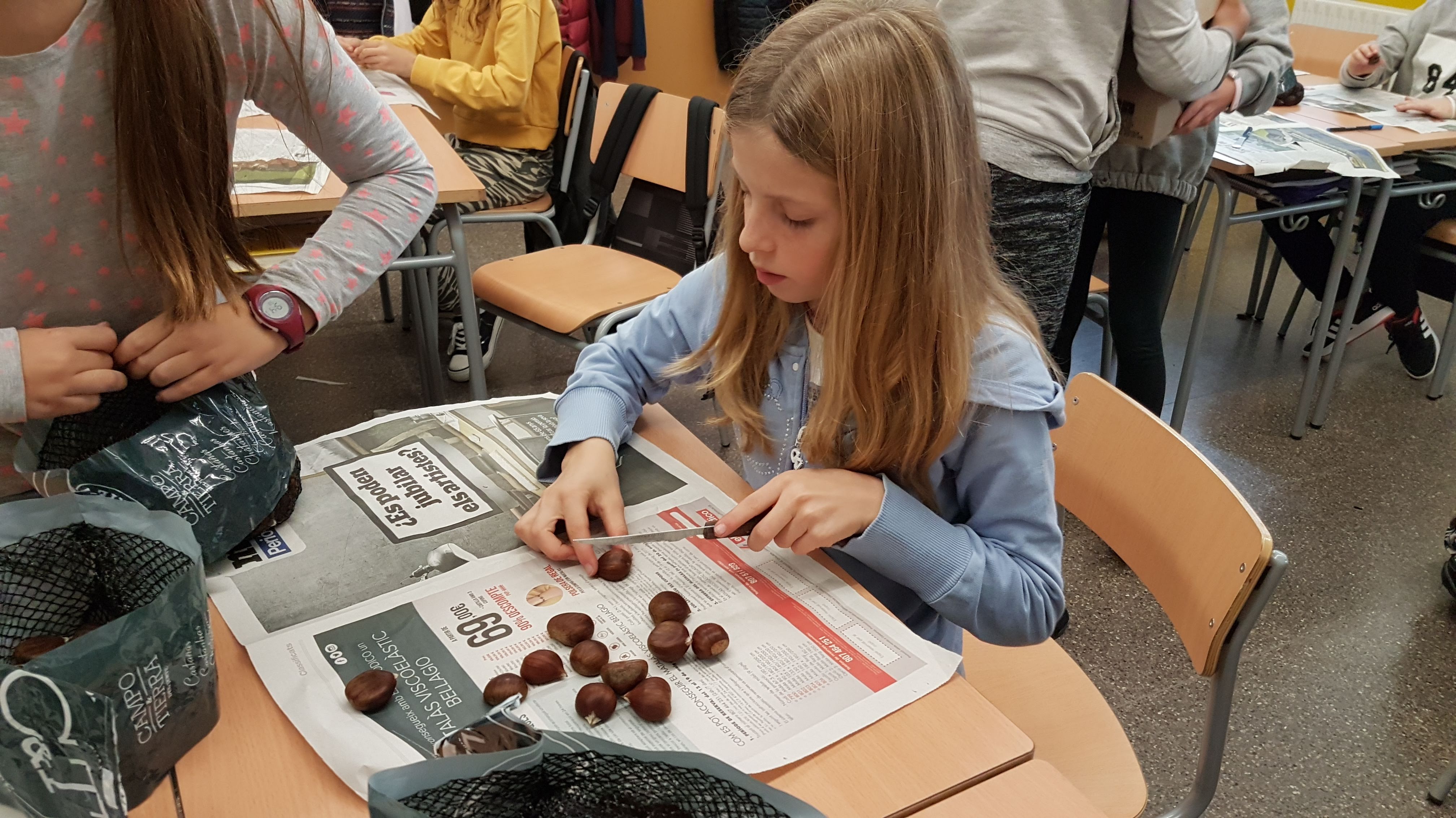 Ep! No ens oblidem de la Castanyada! El dijous 31 a tarda vam menjar unes castanyes boníssimes. Els de 6è hi vam col·laborar fent el tall a les castanyes de tota l’escola.