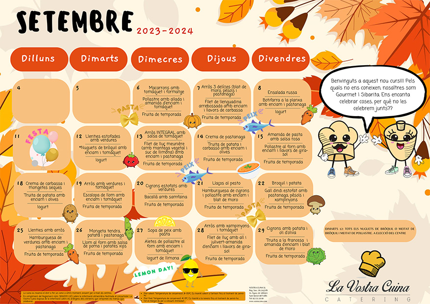 En aquesta carpeta us podreu descarregar els menús del menjador segons cada necessitat. Setembre 23-24