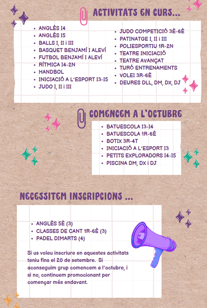 Benvigudes famílies, us passem un petit resum amb les activitats que ja vam començar al Setembre, les confirmades per començar a l’Octubre i les que necessitem inscripcions per tirar endavant.