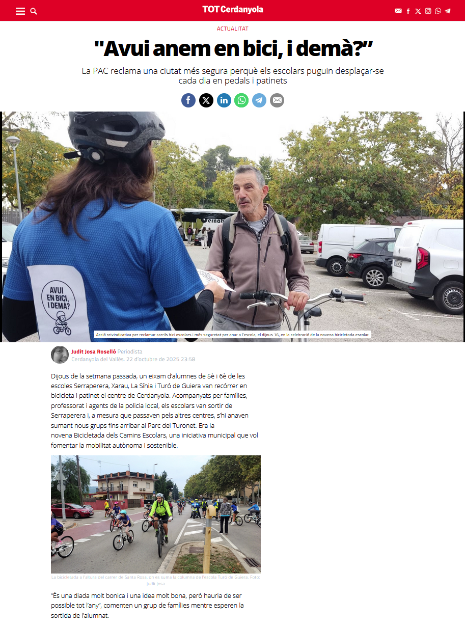 “Avui anem en bici, i demà?” Feu un comentari / Per AFI TURÓ / 24 d'octubre de 2025 / AFI La protesta de la PAC notícia al TOTCerdanyola. Podeu trobar tot l’article aquí.