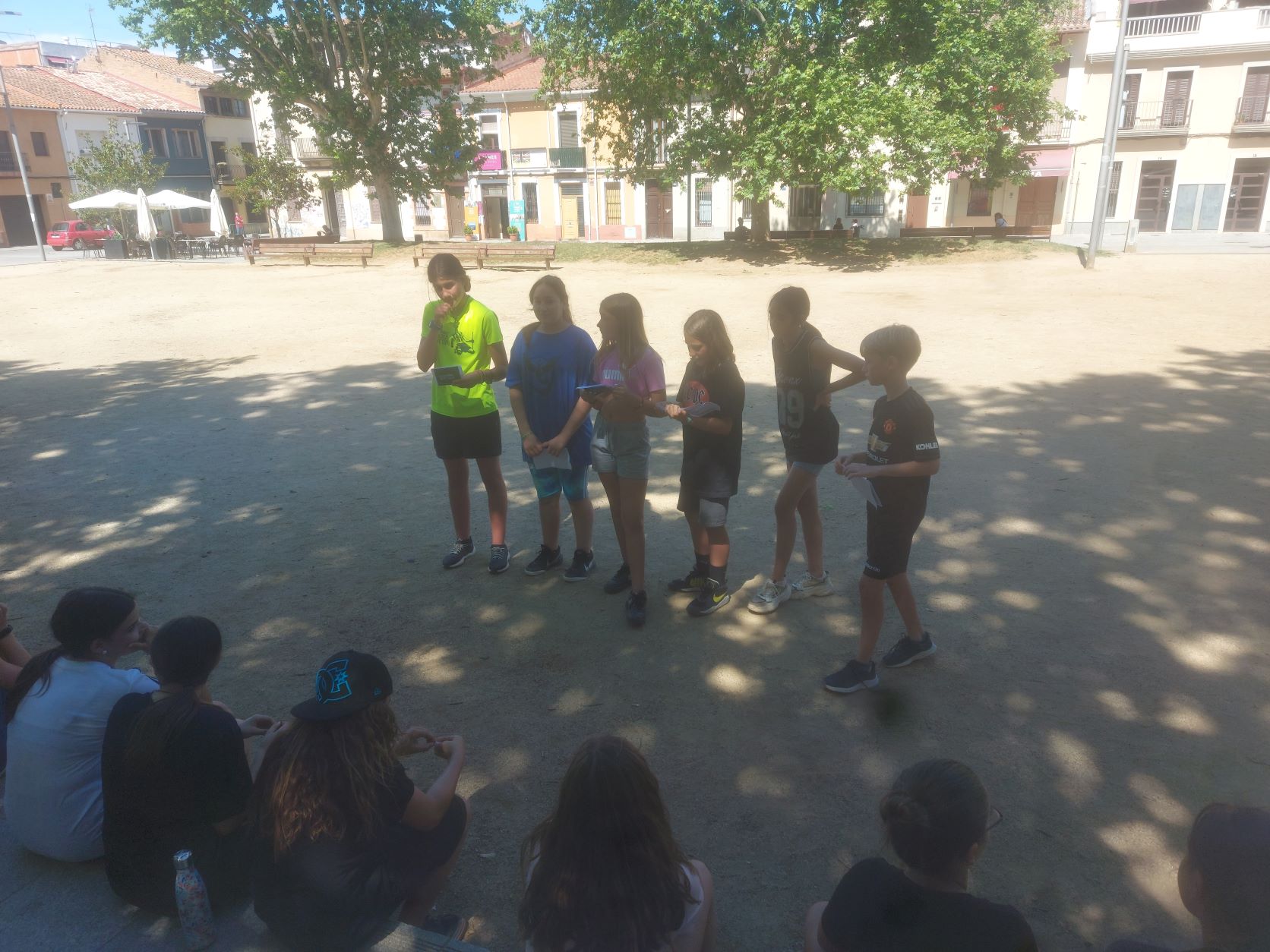 A la 1ª estació, hi havien dos grups i amb un dau un grup el llençava i amb el número que tocava, havíem de fer una volta a la plaça per obtenir els punts, i entre els dos grups havíem d’acumular la mateixa puntuació que era de 15 punts.