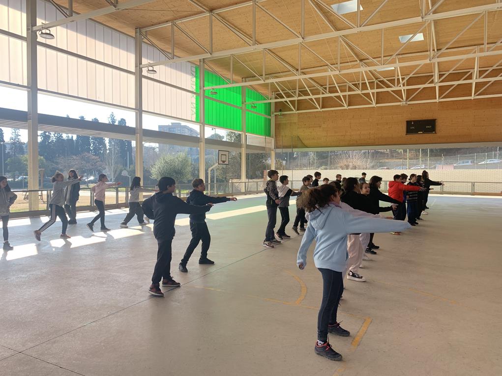 A continuació, vam anar a una altra pista, de fet, estava al costat. Ens van presentar a una monitora que va animar-nos a escalfar per començar a moure el cos. Aleshores, vam notar que ja no feia tant de fred. Quan vam començar a ballar, uns nens petits que anaven a la piscina se’ns van quedar mirant.