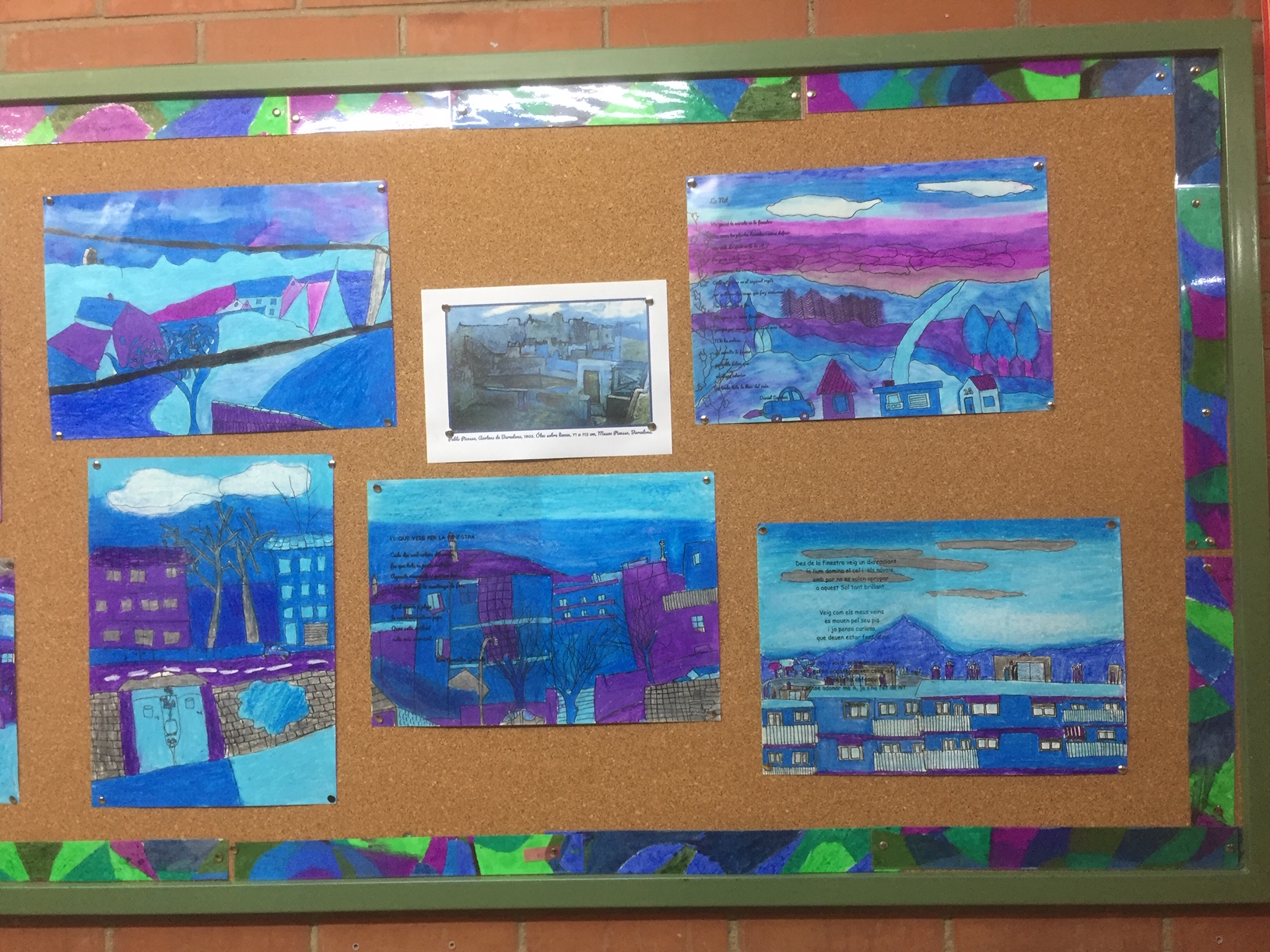 Fa unes setmanes vam començar un dibuix del paisatge que veiem des de la finestra de la casa nostra.Quan ja havien acabat  el nostre dibuix, havíem de pintar-lo inspirant-nos  en l’època blava d’en Picasso. Vam utilitzar tons blaus, liles i negres .