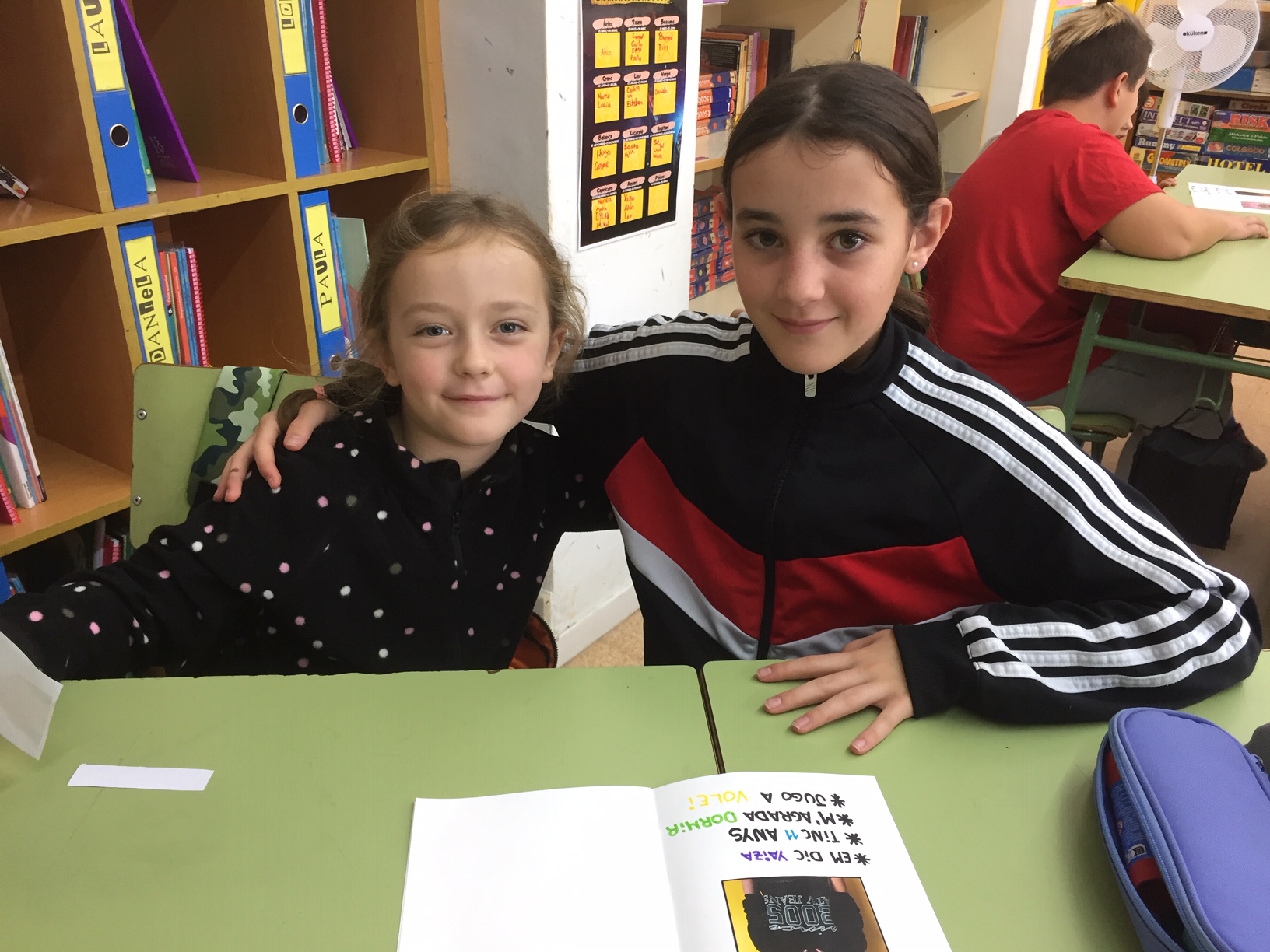 Un grup es va quedar a primer A i l’altre grup va pujar a la classe de sisè A. Quan ja estàvem tots situats vam agafar un llibret que els padrins hem fet per ajudar-los a llegir i escriure. A una pàgina els padrins vam enganxar una foto nostra i vam escriure el nostre nom, la nostre edat, el que ens agrada fer i a què juguem. Els fillols van enganxar la seva foto a la pàgina del costat i els vam ajudar a escriure el mateix que nosaltres. Després el van repassar amb els colors que ells o elles volguessin. Si acabàvem abans d’hora podíem xerrar una mica, els preguntàvem coses o llegíem llibres. Quan va ser l’hora d’anar-no-ens ens vam acomiadar amb una abraçada i els vam acompanyar a la classe.