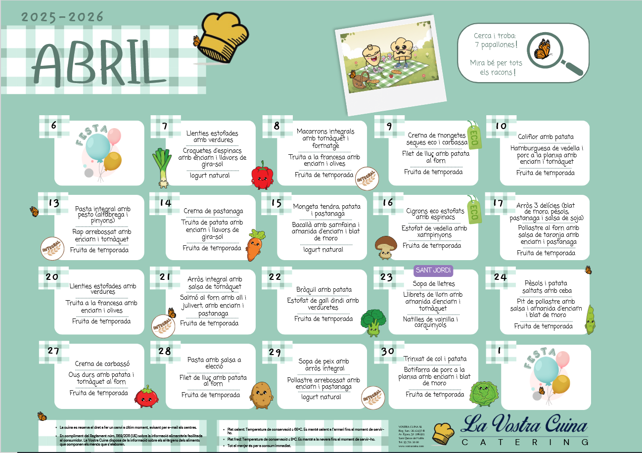 Bon día, ja tenim el menú del mes d’abril. Recordeu que en aquest enllaç podreu consultar la resta de menús que es preparen segons les necessitats.