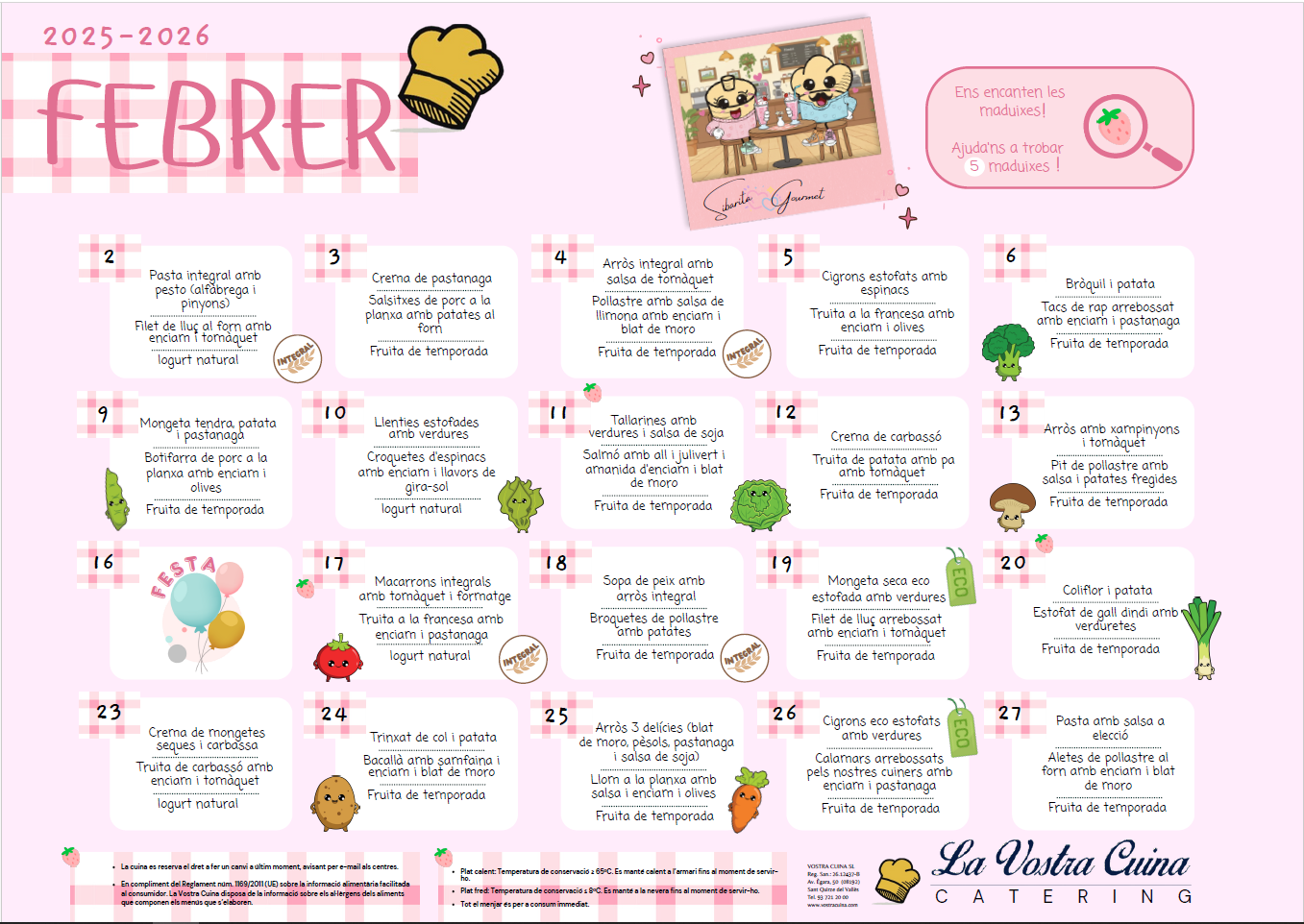 Bon día, ja tenim el menú del mes de febrer. Recordeu que en aquest enllaç podreu consultar la resta de menús que es preparen segons les necessitats.