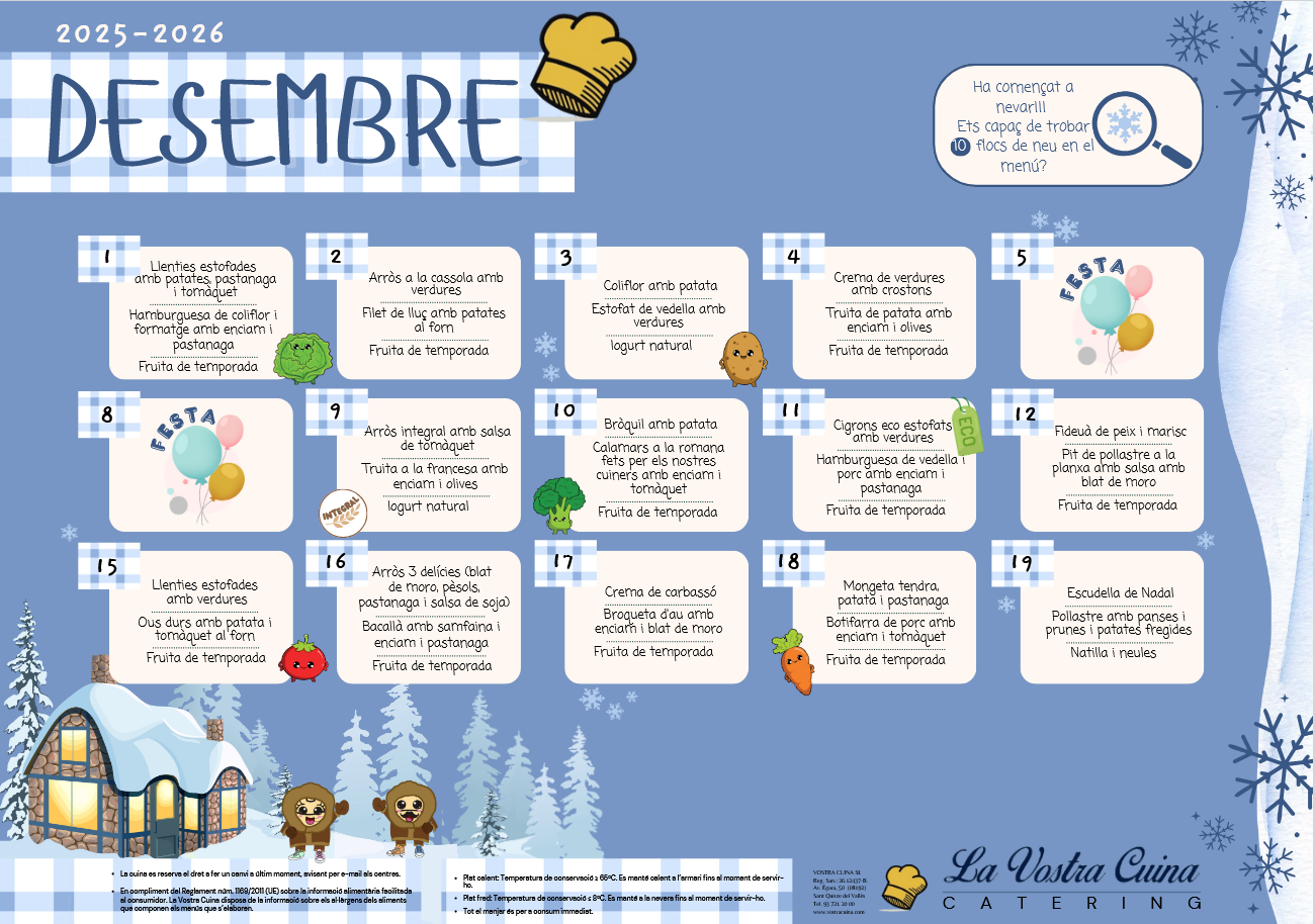Bon día, ja tenim el menú del mes de desembre. Recordeu que en aquest enllaç podreu consultar la resta de menús que es preparen segons les necessitats.