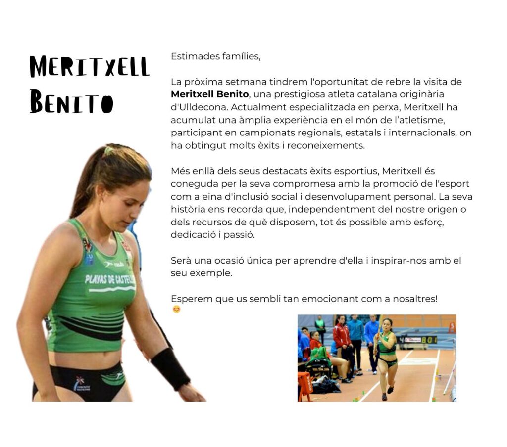 Avui entrevistarem una mestra de pràctiques, que es diu Meritxell Benito i que fa atletisme.