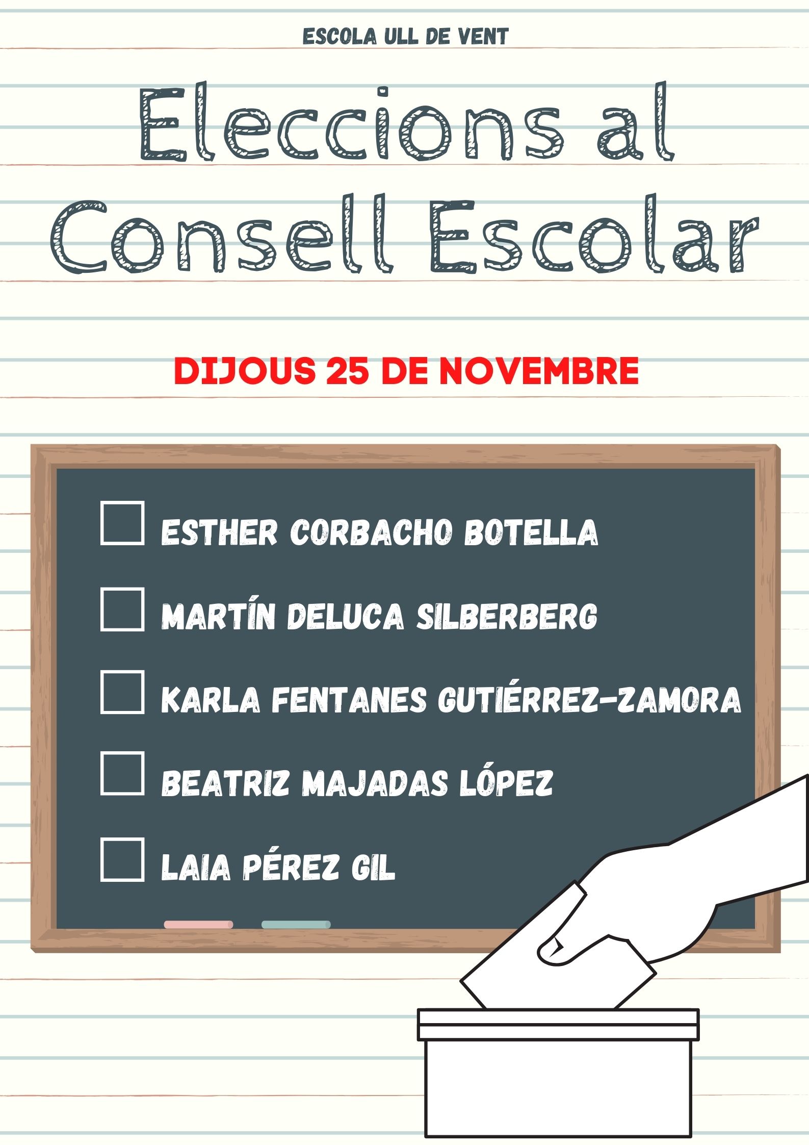 Us recordem que les eleccions seran el proper dijous 25 de novembre de 8:30 a 17:00 a l’edifici nou de l’escolaPoden votar tant el pare com la mare de l’alumne o el tutor legal si s’escau, cada elector podrà escollir un màxim de tres candidats.