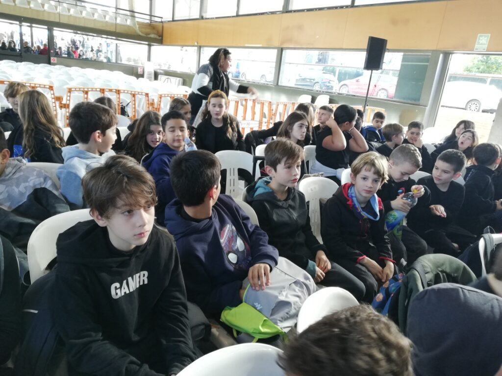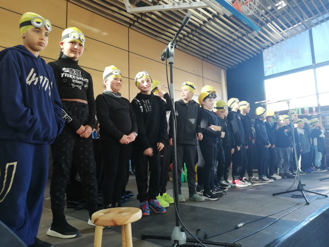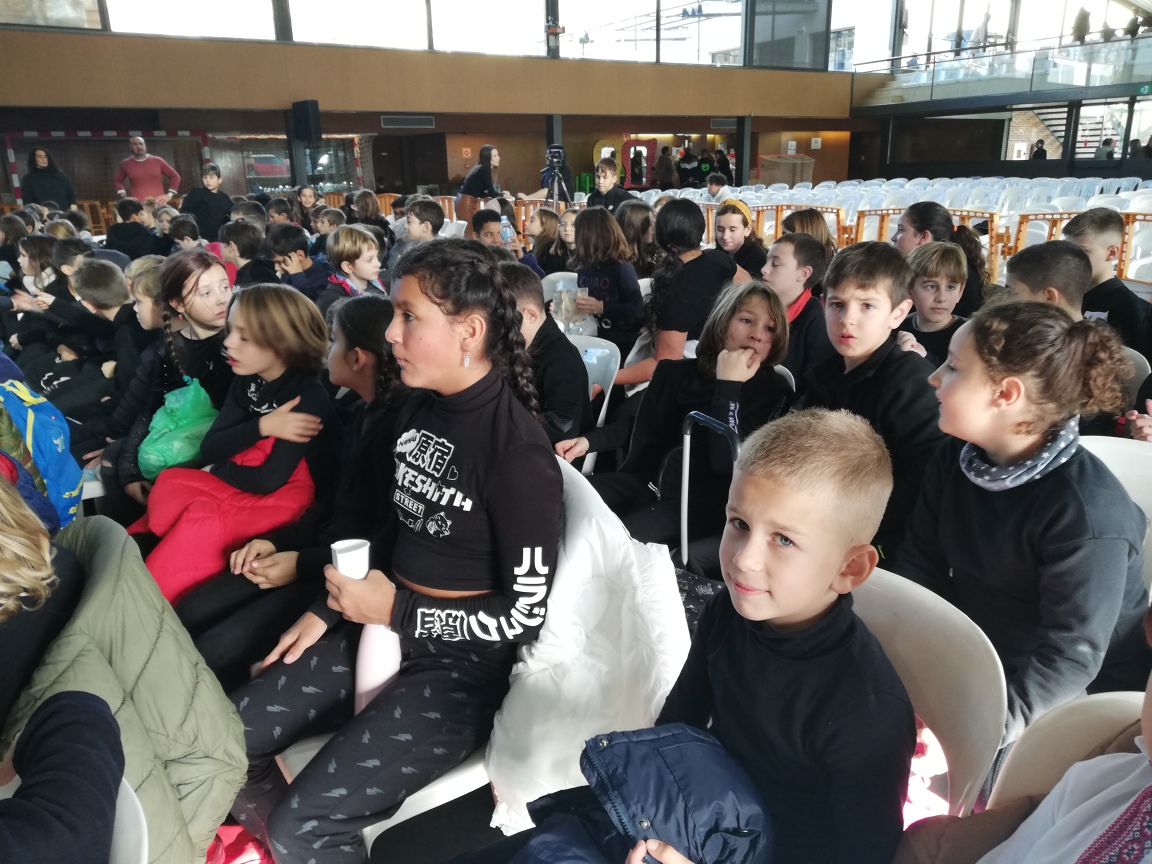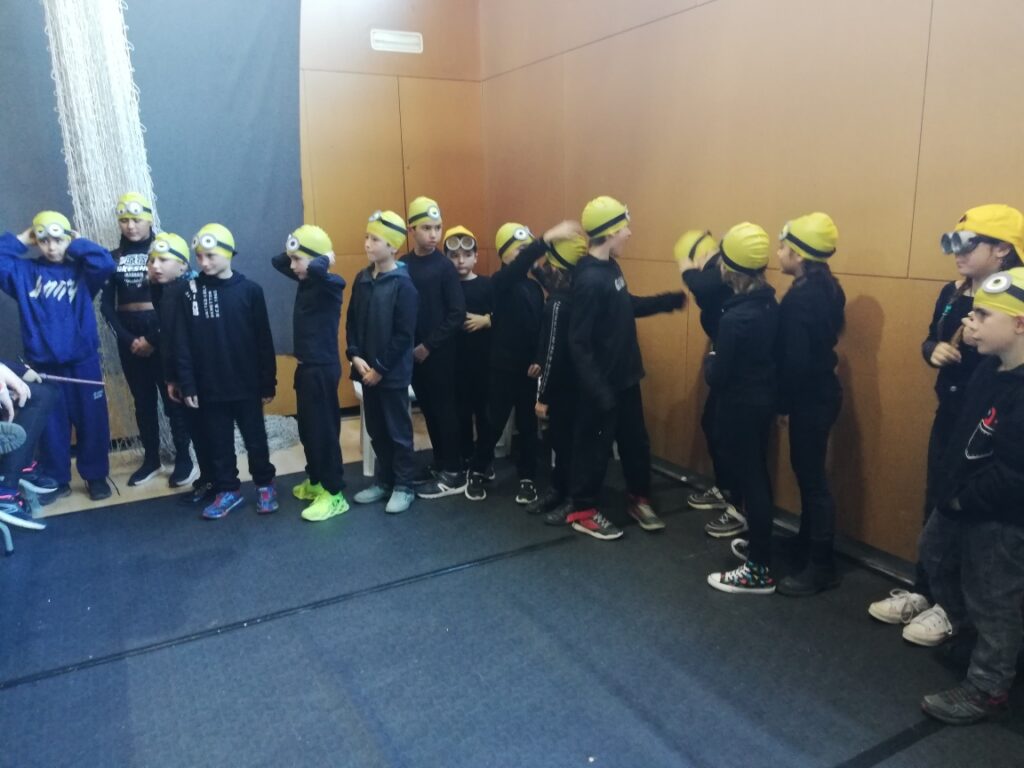 I després del pati hem anat al pavelló de Castell d’Aro igual que la resta de nens i nenes de l’escola Vall d’Aro a fer el Festival de Nadal. Nosaltres, com que aquest any som la classe dels Minions, ens hem vestit tot de negre i al cap hem portat un gorro de piscina de color groc i unes ulleres, també de piscina.