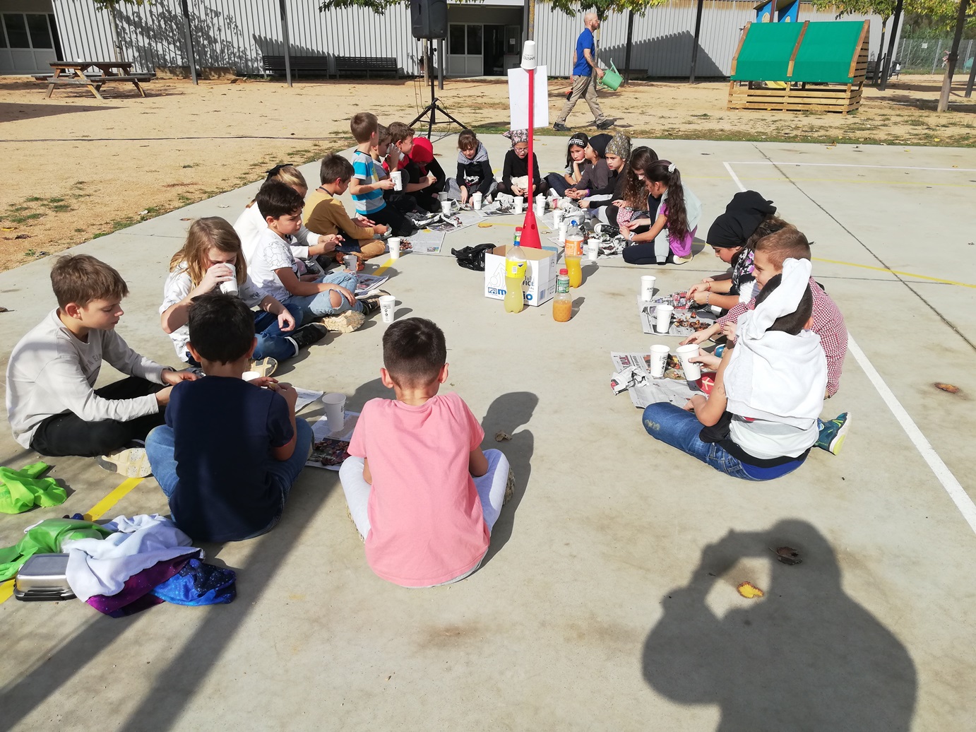 La majoria de nens i nenes hem anat a l’escola disfressats de castanyers i castanyeres. A mig matí han vingut els Castanyers Majors de l’escola a buscar les castanyes que hem portat aquesta mateixa setmana i les paperines que hem fet a classe. Després del pati, com que la pista era seca, ens hem assegut en rotllanes i hem menjat les castanyes que han torrat les famílies de l’AFA, hem begut sucs,… i al final, quan han entrat les famílies hem fet ballat la dansa “The Sweets of May”.