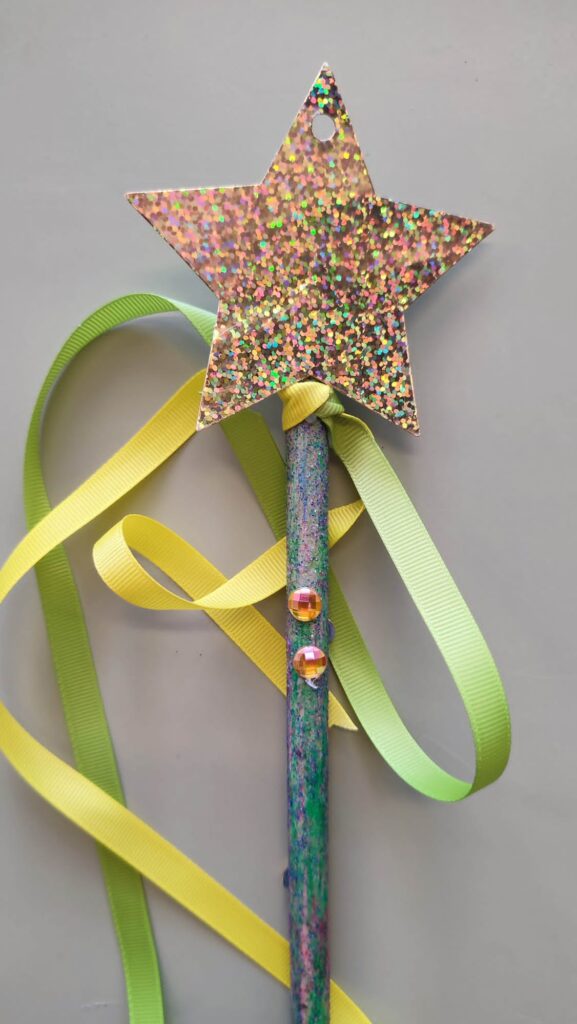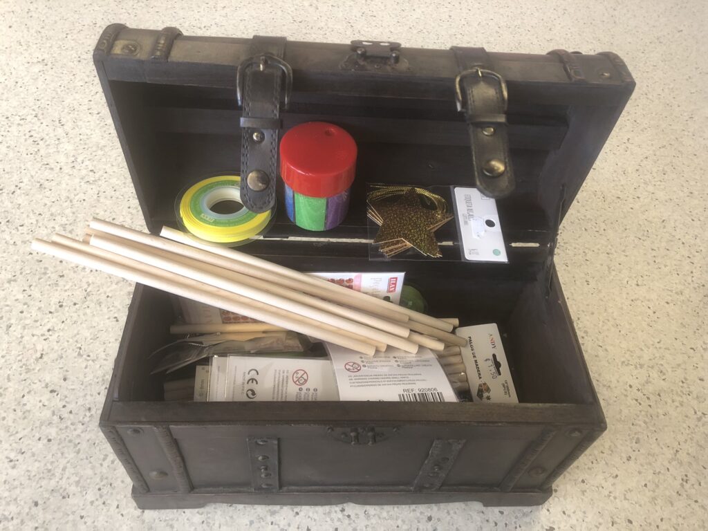 L’endemà ens esperava un cofre amb material per fer varetes màgiques. La fada Tina ens va dir que no podíem ser unes fades autèntiques sense les nostres varetes! Així que vam decorar els pals de fusta amb ceres i després les vam vernissar posant-hi molta pols de fada!