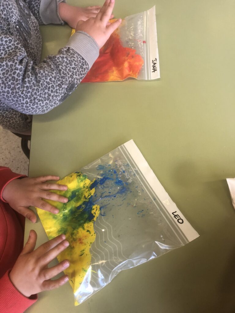 Vam acabar el dia fent una mica de màgia amb una idea de la fada Tina, la nostra fada. Cadascú tenia una bossa de plàstic transparent amb zip i va escollir dos colors d’uns preseleccionats. Vam posar els colors dins les bosses i quan tots vam estar preparats vam dir unes paraules màgiques i vam començar a remenar i aleshores els colors es van convertir amb altres de nous!!! El blau i el groc van fer VERD, el groc i el vermell van fer el TARONJA, el vermell i el blau van fer LILA, el blanc i el vermell van fer ROSA i etc.