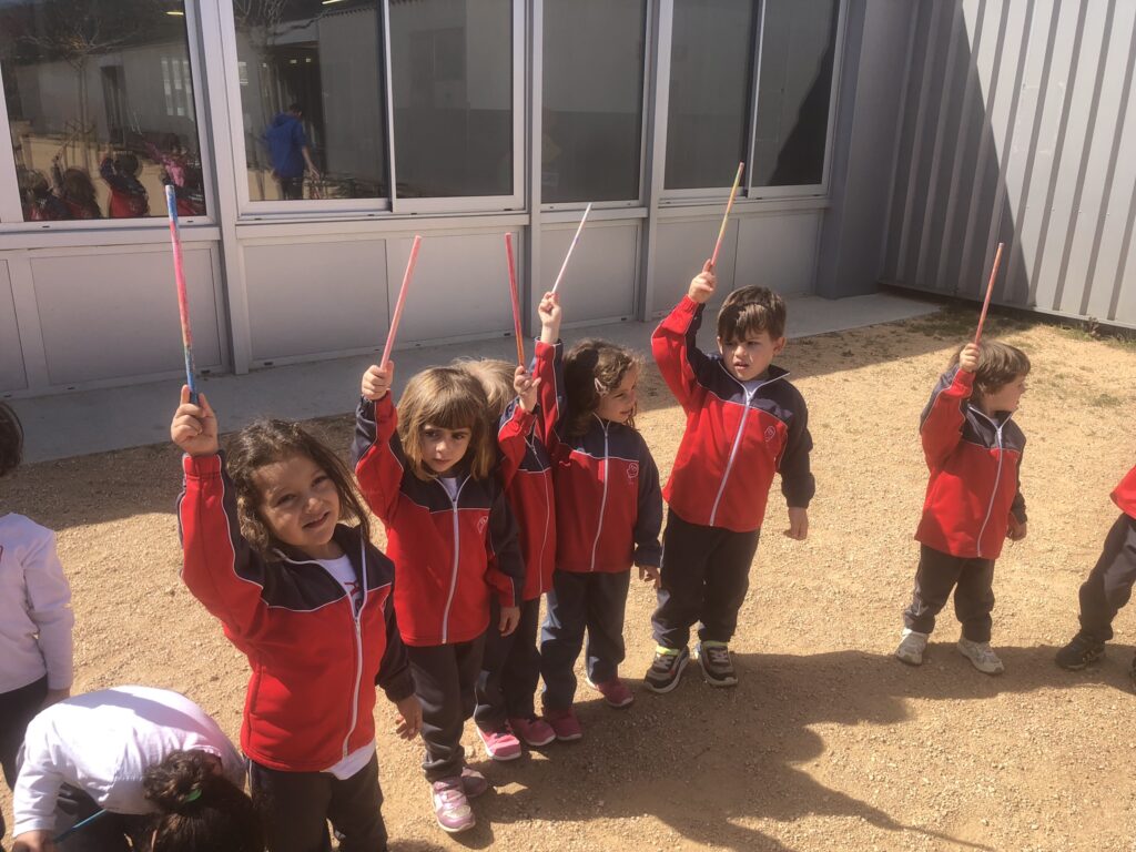 Després del pati, vam anar al bosc a buscar les paraules màgiques que necessitàvem per activar les varetes. Sabeu que les paraules màgiques no les podem trobar a tot arreu???? Les porta el vent i les rega la pluja. N’hi havia unes preparades especialment per a nosaltres!!