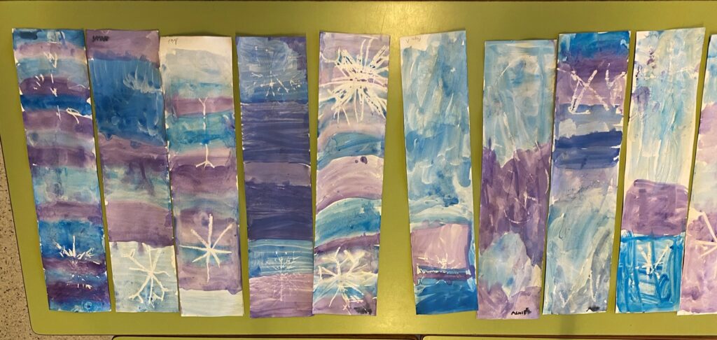 Aquests dies hem estat decorant el nostre passadís i ho hem fet amb diferents colors d’hivern. Vam pintar tires de paper amb cera blanca, vam dibuixar flocs de neu i seguidament vam pintar amb aquarel·les.