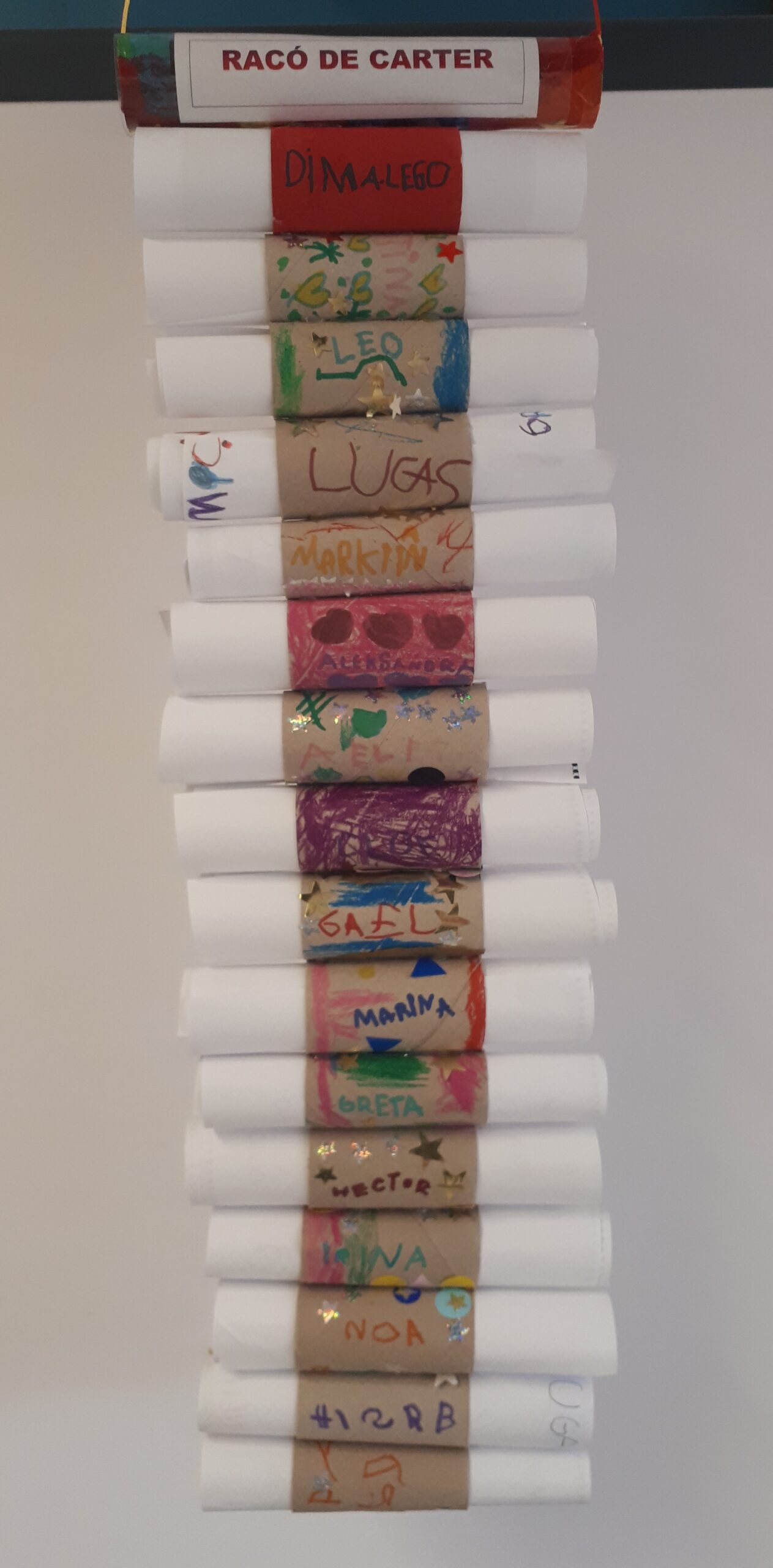 És una activitat molt celebrada. Els encanta tant preparar “cartes” pels altres com rebre-les. Vetllem perquè tothom en tingui (fa molta il.lusió) i, tot i que al principi necessiten ajuda per escriure frases curtes i algun petit text, amb el pas de les setmanes es converteix en una tasca molt més autónoma.