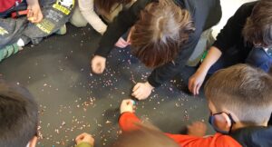 4. Per fer el BIG BANG hem explotat el globus BANG!!!. Les partícules s’han escampat pel terra, a sobre del paper negre que ja havíem preparat. Hem vist que totes les partícules s’han escampat! ha sigut espectacular!