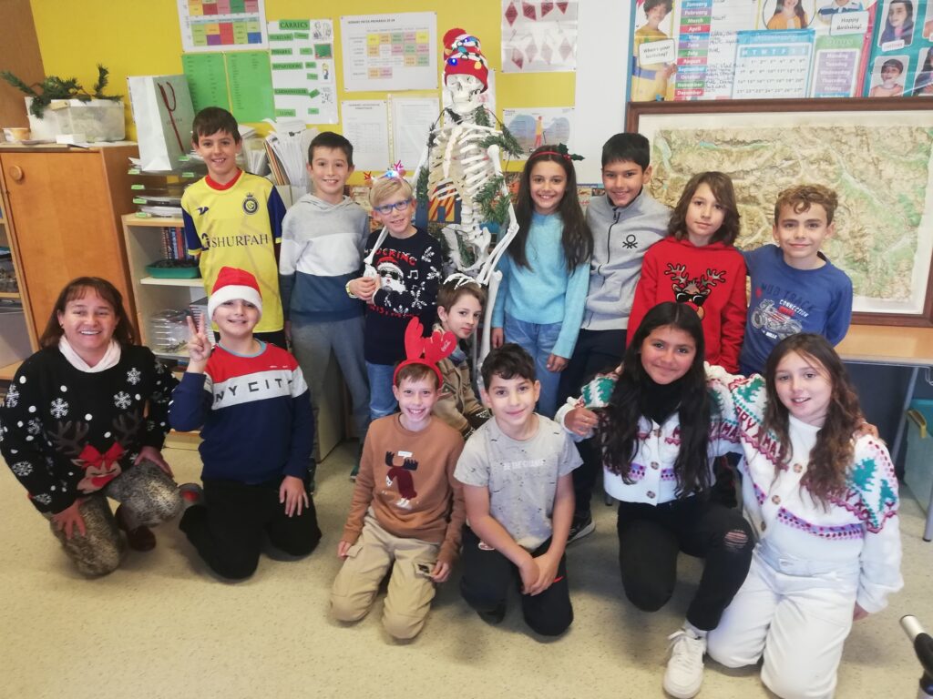 Ja hem acabat els controls, hem fet el regal i la postal per a les famílies,… i mentre ens anem aprenent el vers per poder-lo recitar als avis, tiets, cosins, etc., dalt d’una cadira, el dia de Nadal, un dia vam anar a l’escola amb un jersei de Nadal. Estem molt guapos i guapes amb el nostre amic, en Pepe, que s’ha posat un gorro per sortir a la foto. També hem fet l’amic invisible i al final hem cantat les cançons en català i en anglès al festival que, com cada any, hem celebrat en el pavelló.