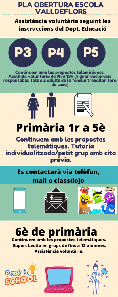 L’escola contactarà amb les famílies mitjançant formulari de google, que hauran d’omplenar aquelles que vulguin assistir al centre i que cumpleixin els requisits per a poder-hi assistir. La data límit per a contestar és el dijous 28 de maig a les 15h., per a poder organitzar els espais i horaris d’entrada i sortida de l’escola.