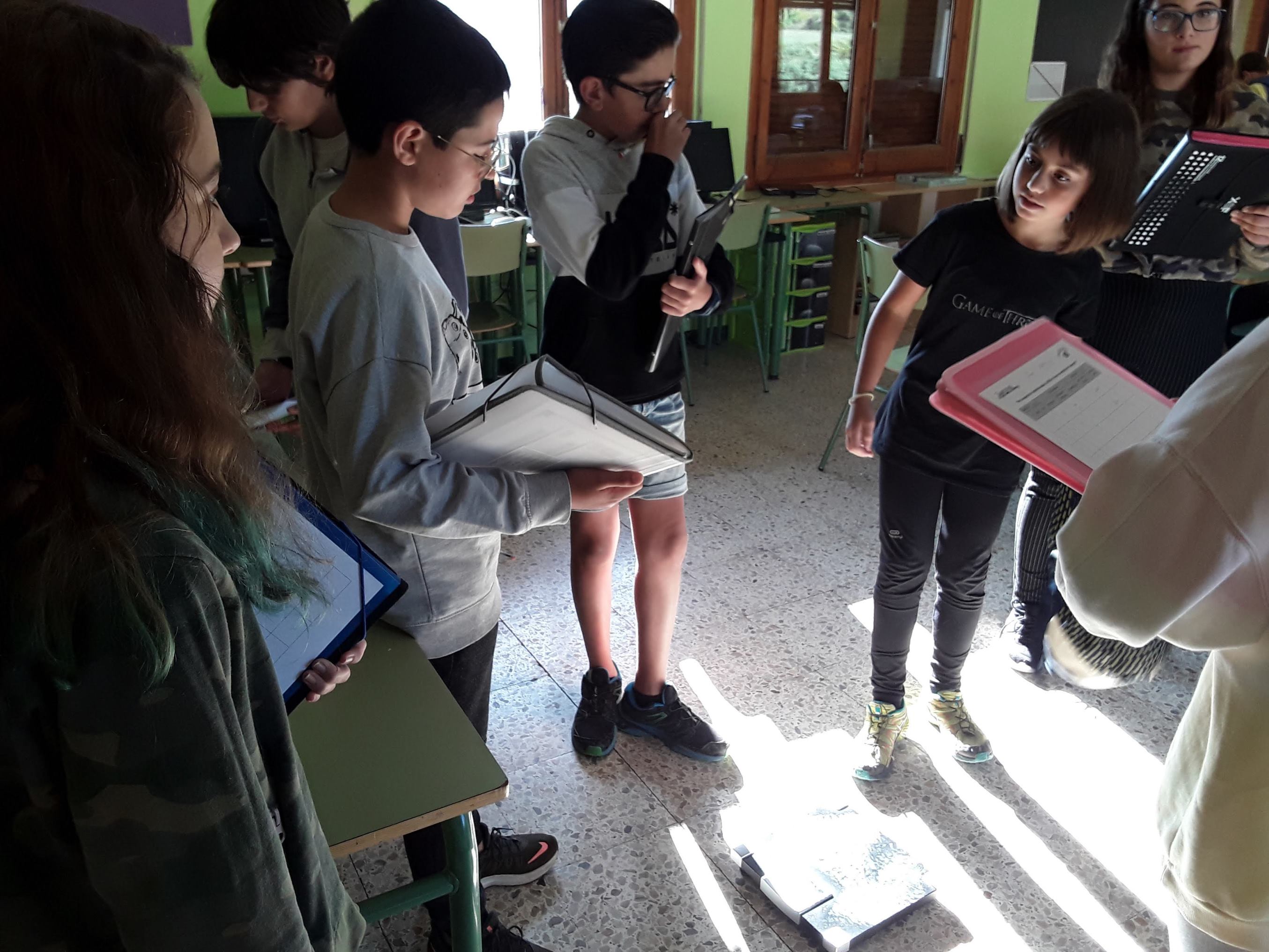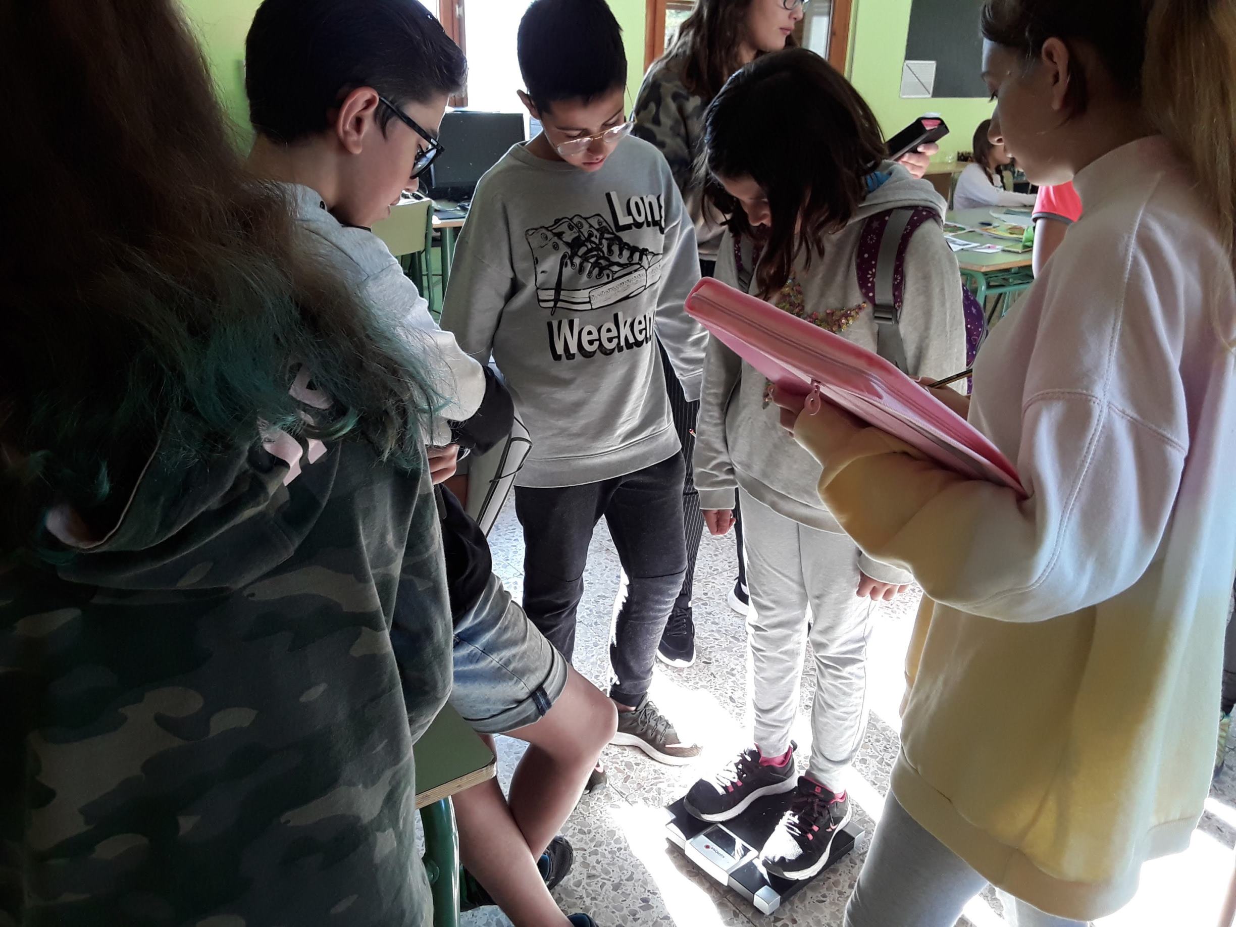 Els companys de 1r d’ESO estan estudiant la salut de l’esquena a educació física, per això, avui han vingut el Pau, l’Alícia, la Laura, l’Oscar i l’Adrià a pesar-nos la motxilla.  Com que la bàscula no pesa quantitats de menys de 5 Kg, primer ens pesaven sense la motxilla i després amb ella, comprovaven la diferència de Kg i ho anotaven per fer una estadística.
