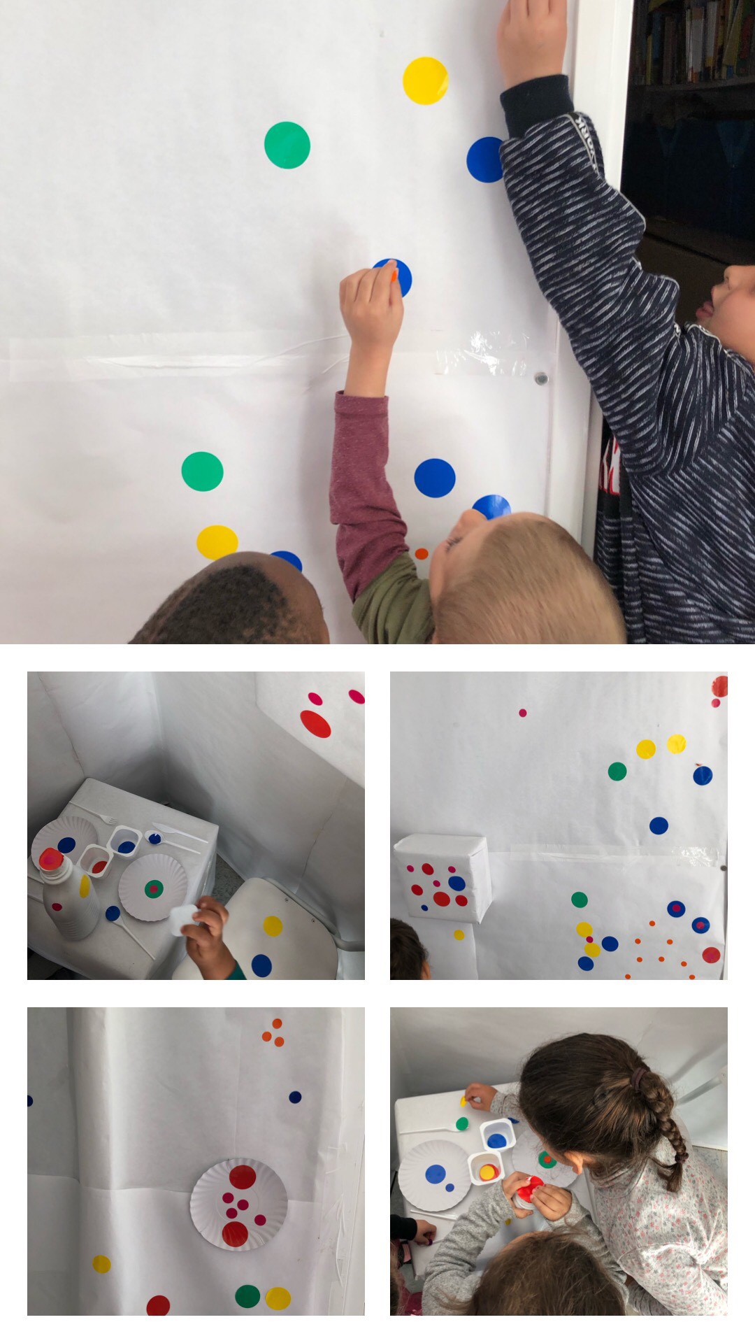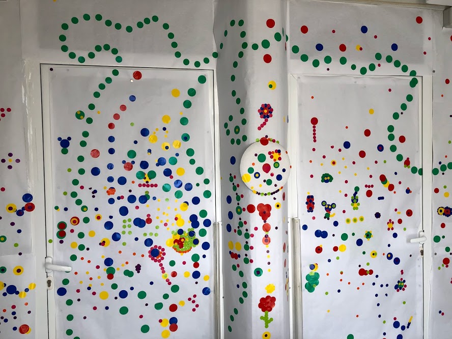 A més a més, vam conèixer que l’artista treballava instal·lacions a partir d’art participatiu i hem volgut reproduir una de les seves obres al vestíbul d’infantil que està encara en procés de creació. Per aquesta raó, us volem donar les gràcies per la vostra participació i implicació; així mateix us animem a continuar enganxant gomets!!!
